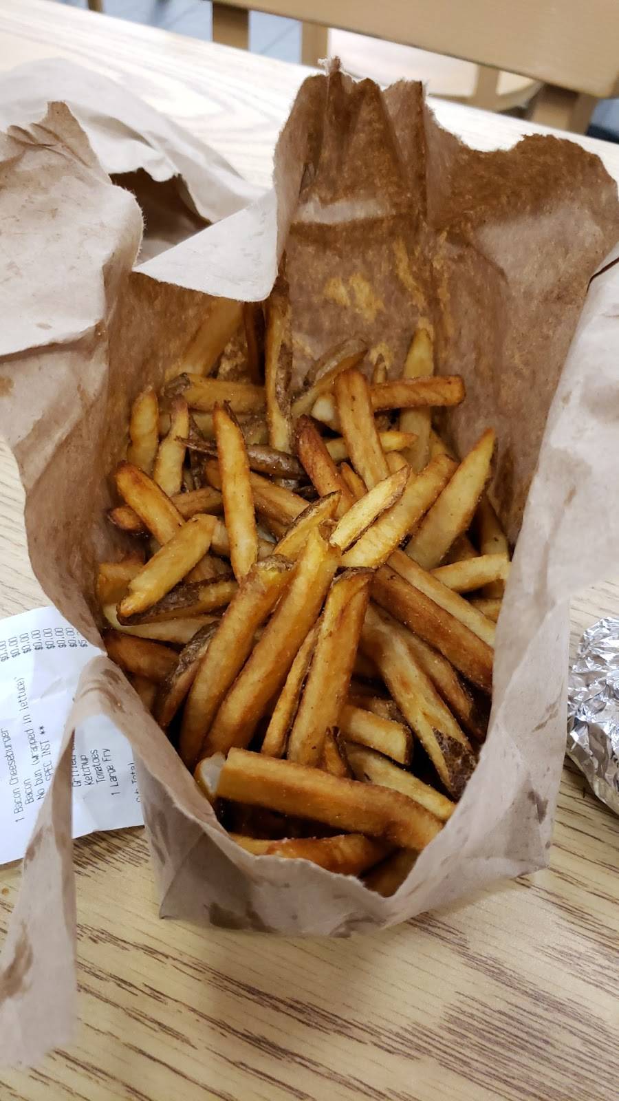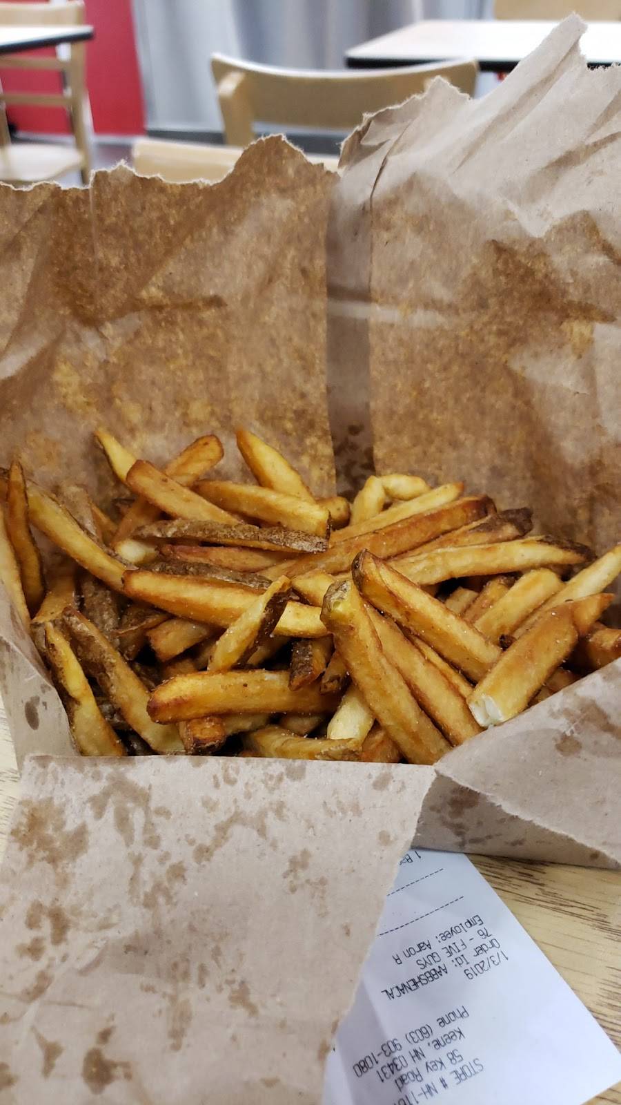 Hadn't had five guys burgers in over 10 years! My wife and i stopped in at keene last weekend and enjoyed there food! I had a double cheeseburger with all the works and it was tasty but just a little greasy! The fries are amazing! Home made and delicious! Pretty good food! Just a little pricey!