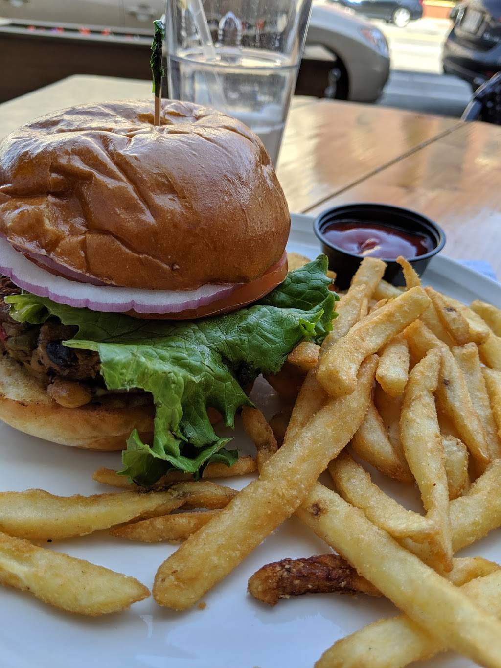 Went here for Memorial Day, got a seat outside and it was wonderful! They brew their own beers - I had the Velvet Elvis vanilla stout and it was delicious. Decent selections of other drinks, cocktails and wines, as well as a multitude of food options from mac n cheese, pizza, burgers, to salad and a whole Greek inspired section. We got the fried pickles as an app and weren't disappointed. I ordered the house made black bean burger and it was yummy. I can't speak to the interior of the restaurant yet, but I definitely recommend coming here when the weather's nice and sitting outside!