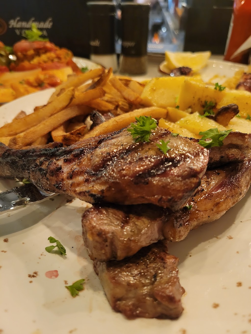 We ordered then 3 dip appetizer, meat grape leaves and chicken skewers. We will be back to try more of their tasty dishes. (There was more food. The photo was taken after we tried everything)