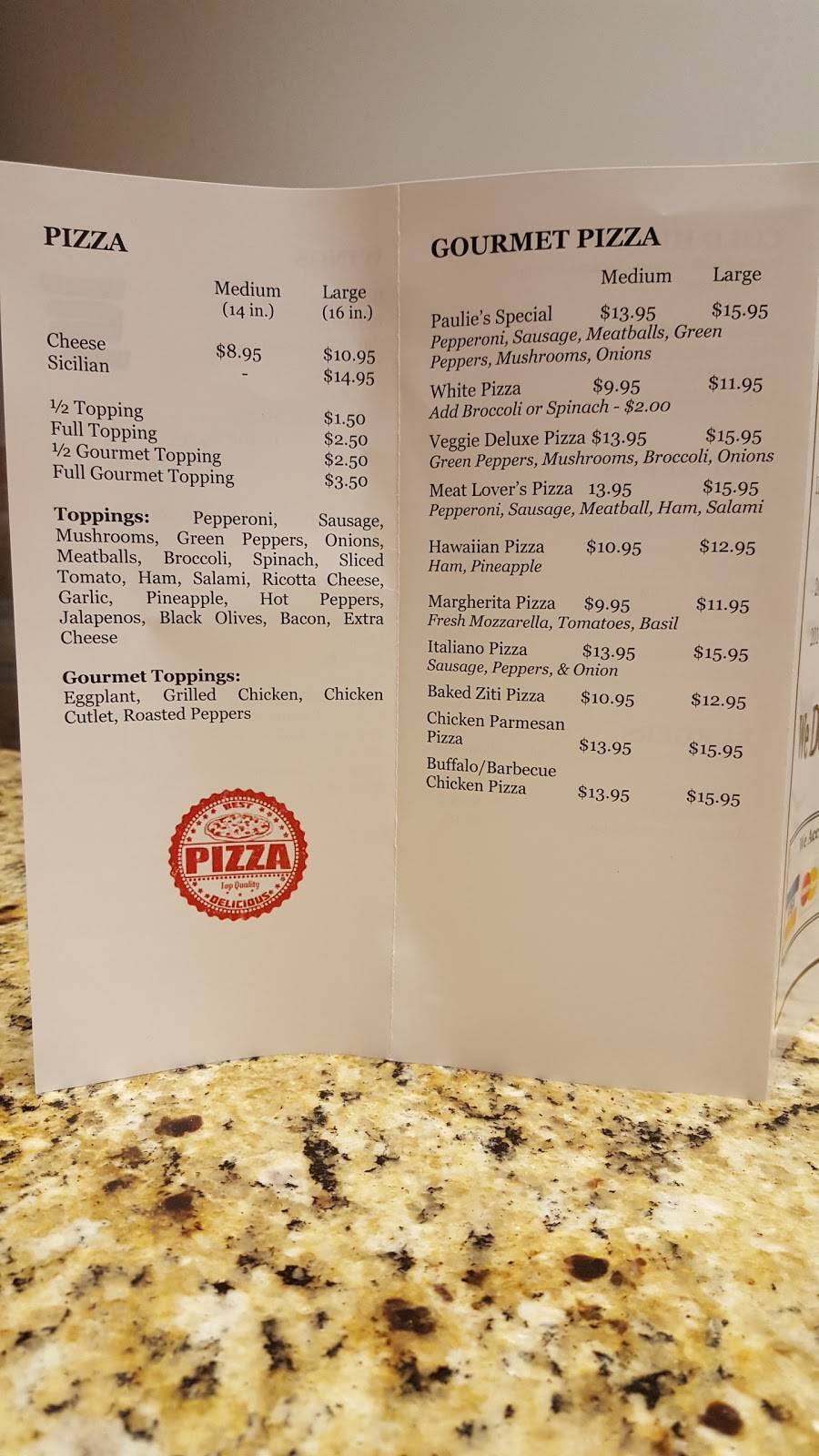 The pizza was delish, crispy crust and well balanced. It isn't always too crowded making it the perfect place to go after school or during lunch. This is by far the best pizzeria in town, and the prices are reasonable as well.