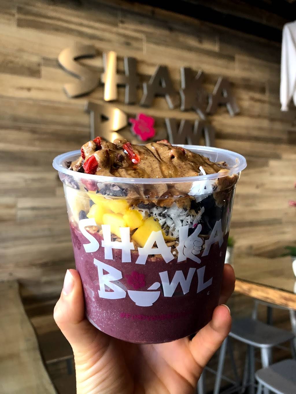 acai base vegan , banana, strawberry, granola gluten free dairy free nut free cacao nibs, goji berries, chopped almonds, nutella