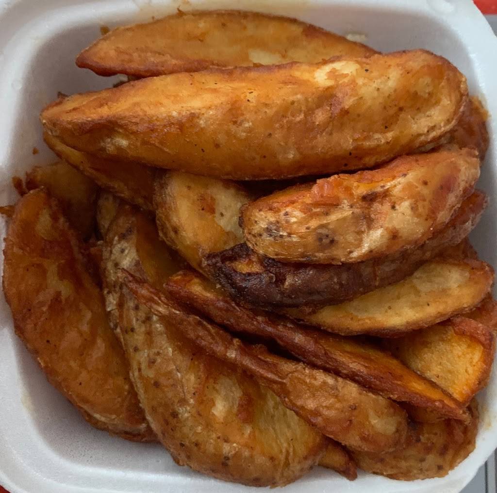 Chicken is good. They sell bottles of their famous sauces.