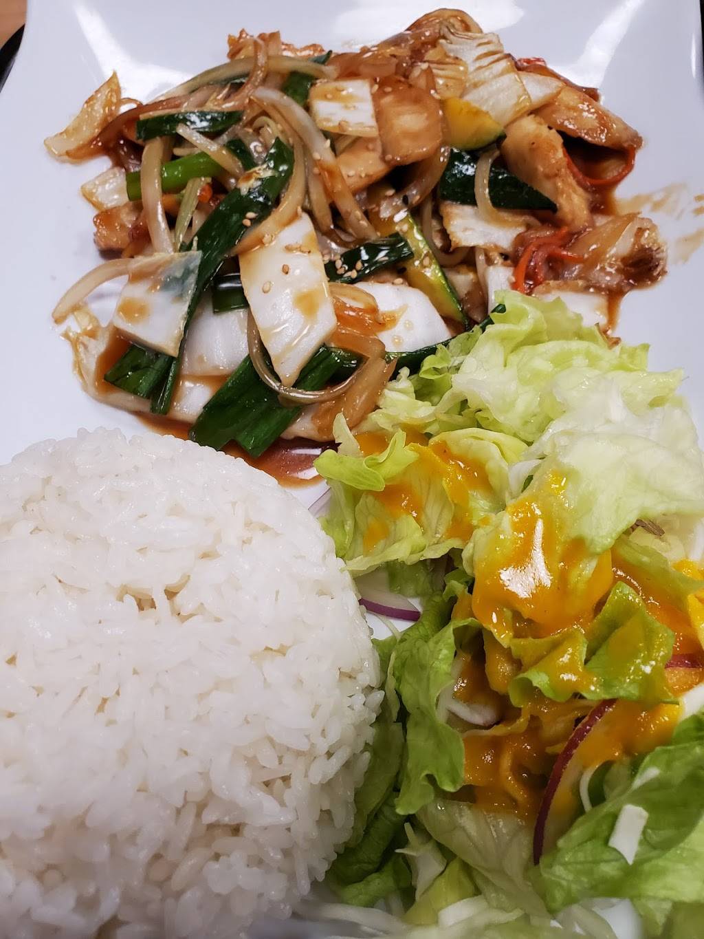 The chicken teriyaki was good too. However, it was more vegetables than chicken. The food comes with Kim chi and a bowl of soup. The soup is located at the cash register. Not sure about hygiene for the soup.