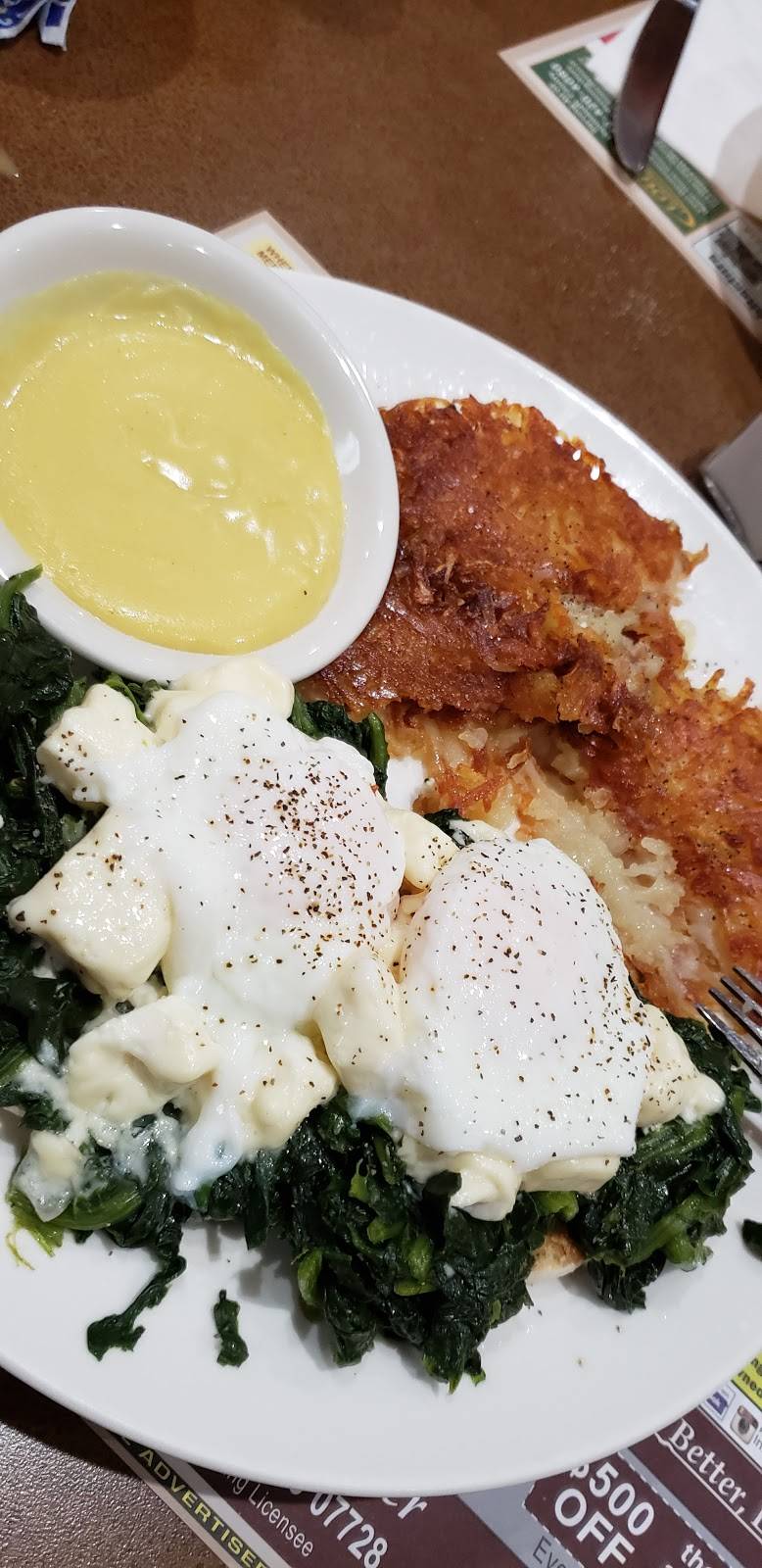 We must have caught them on an off day.. Seemed a little unorganized. I counted about 15 empty tables and they seemed to have a hard time figuring out where to seat us. After we were seated, someone came over and asked what we would like to drink and when they came back with our drinks, asked to take our order and we haven't even been given menus yet. Eggs were a little runny, but ok. They don't use real butter.. French Toast was very good.. Hollandaise Sauce tasted like powdered and looked more like mustard and was served on the side in a separate dish (very strange). When we were done, some guy (not our waiter) came over to take our plates away and said he would get our check.. He never came back.. We saw him standing in the front looking at his cell phone..