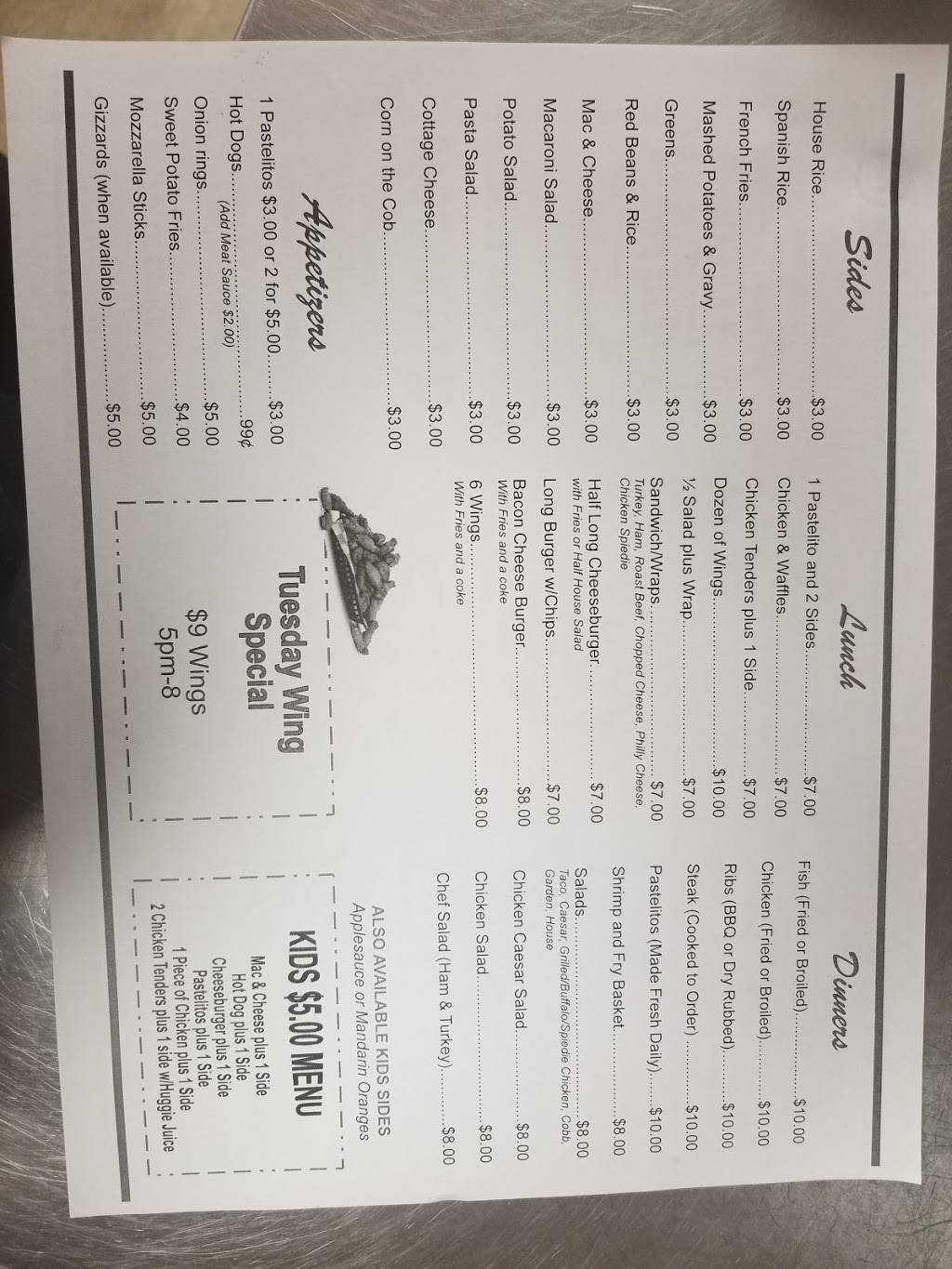 Food is very good and always homemade.Prices are great you can get a Steak with 2 sides 10 dollars WOW!!!!Thanks for the Ice cream you gave my Granddaughter she loved the food also even at 9 months she knows Lol.