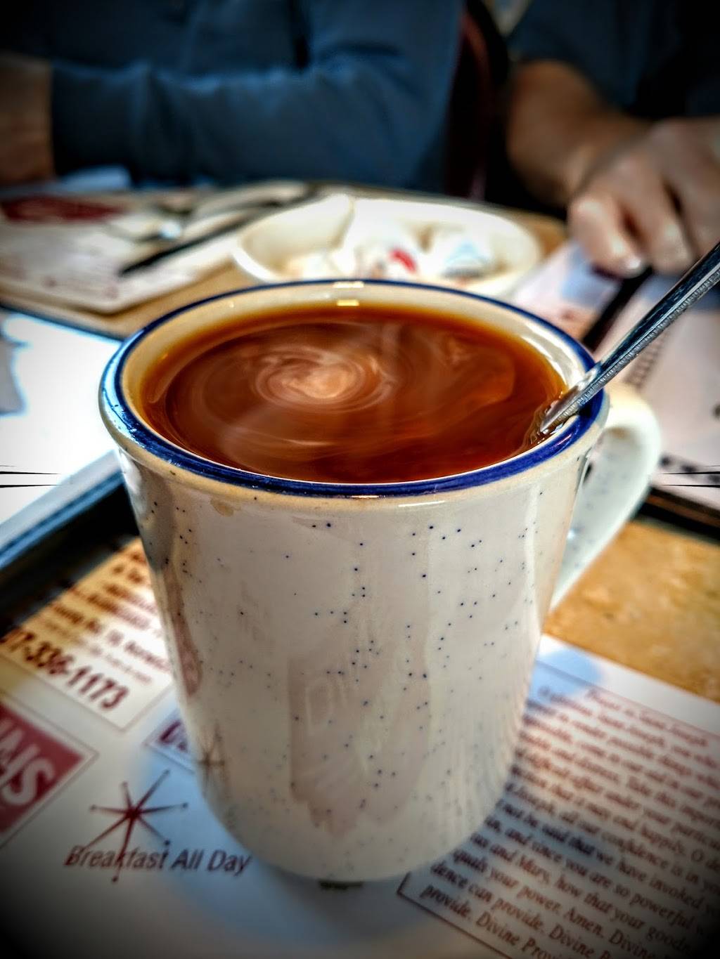 It's a friendly atmosphere comfortable tables and great waitresses and really good food