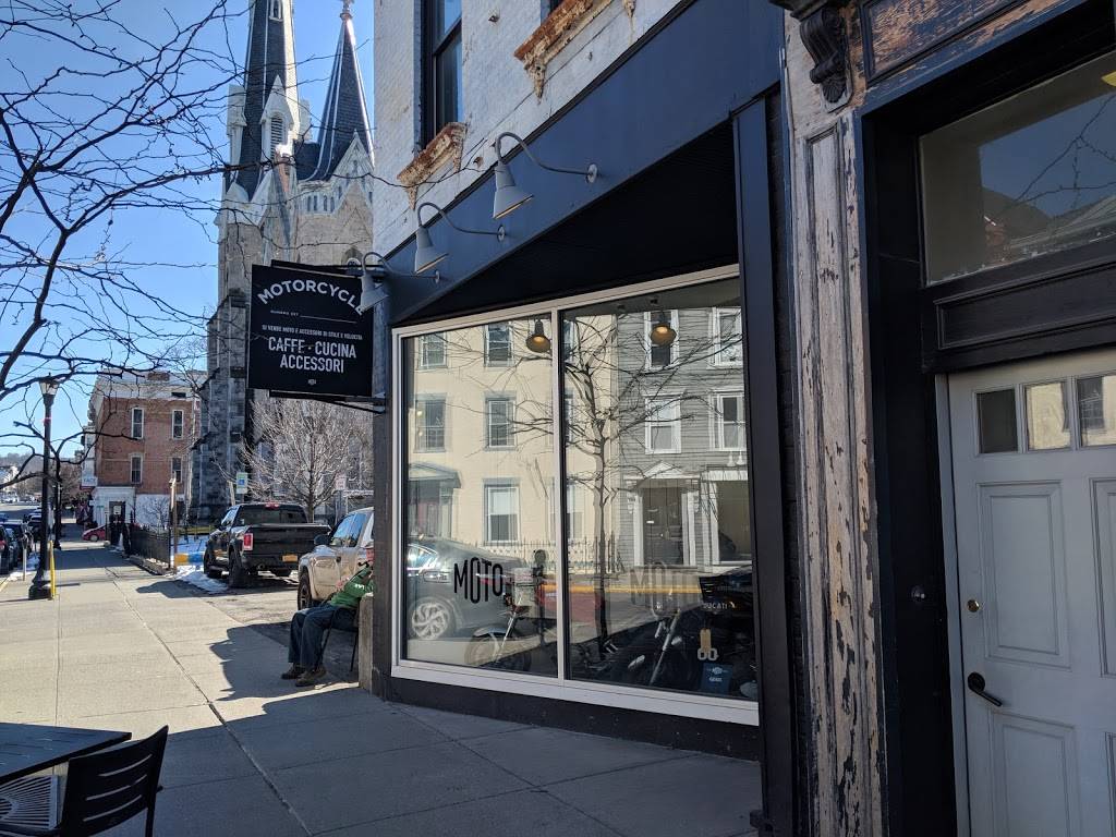 I love this place. The service is top shelf (friendly, attentive, attitude-free and as sweet as the cookies they sell). The coffee is probably the best in town. Great selection of bike related items ... good mix of locals & tourists. The only downside is that one leaves smelling like griddle oil ... the space needs a better ventilation system. "THE" place to visit in Hudson for a coffee, waffles, a snack .... and a motor bike!