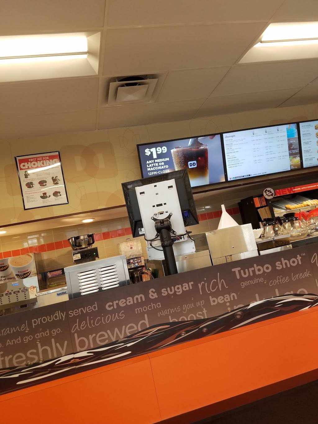 A good one with little seating arrangements. Good for a rest stop and grabbing refreshments. I like their coolattas with strawberry and vanilla bean. They should have restrooms more than one. It just have one so usually there is a line for restrooms. Over all is good. This Dunkin is visible from far while driving. And no other cafe around this spot. So this is good for a cup of coffee or doughnut on the go.