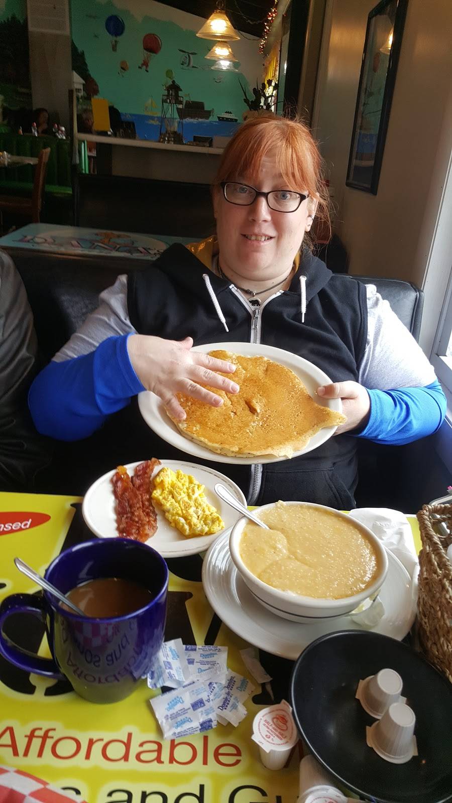 Papa Bear breakfast menu item was delicious French bread French toast was cooked perfectly! Hash browns were perfectly crispy, chocolate pancakes we're fluffy and perfect! Corned beef hash was perfect as well and everything reasonable priced!!