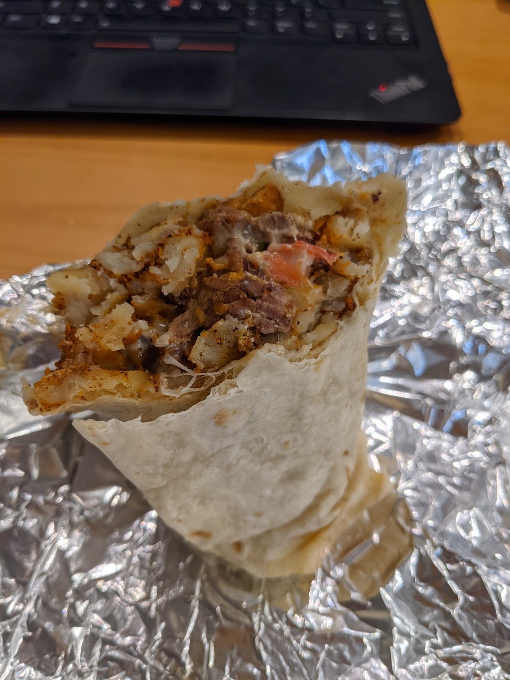 The burrito was over-stuffed and the fries were reheated and soggy