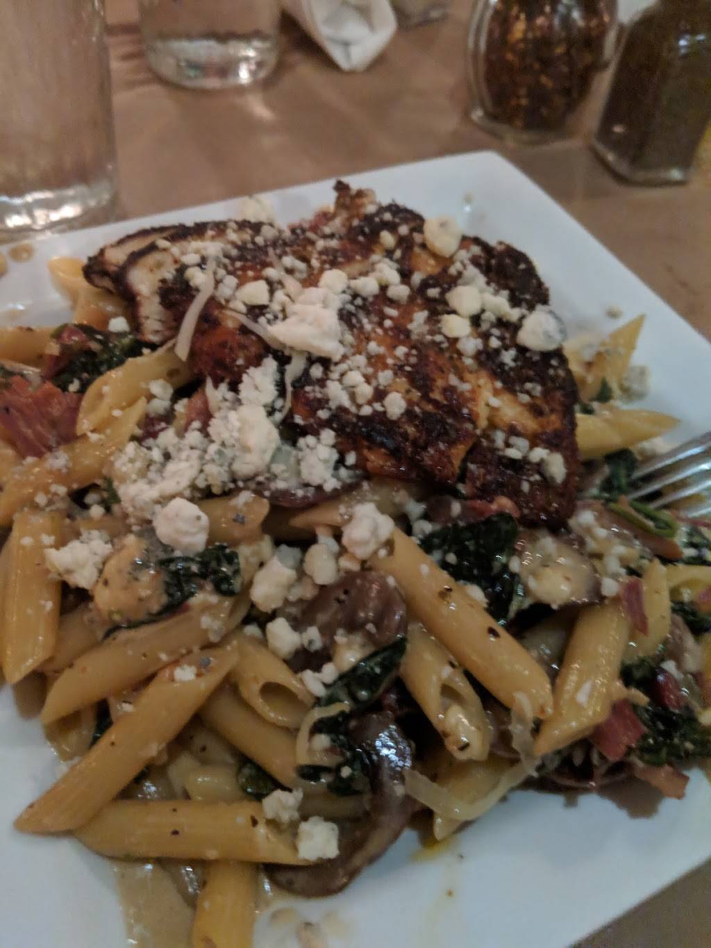 Nice clean restaurant. The staff is courteous and quick. The Panzari burger was excellent. The fettuccine Alfredo was also good. The white pizza is perfect. The bar and kitchen are visible. Stone bakery for ???? is also visible. Prices were in the range I expected. $73.80 for 4 Adults before tip. Left a $15.00 because our server Kevin did well.