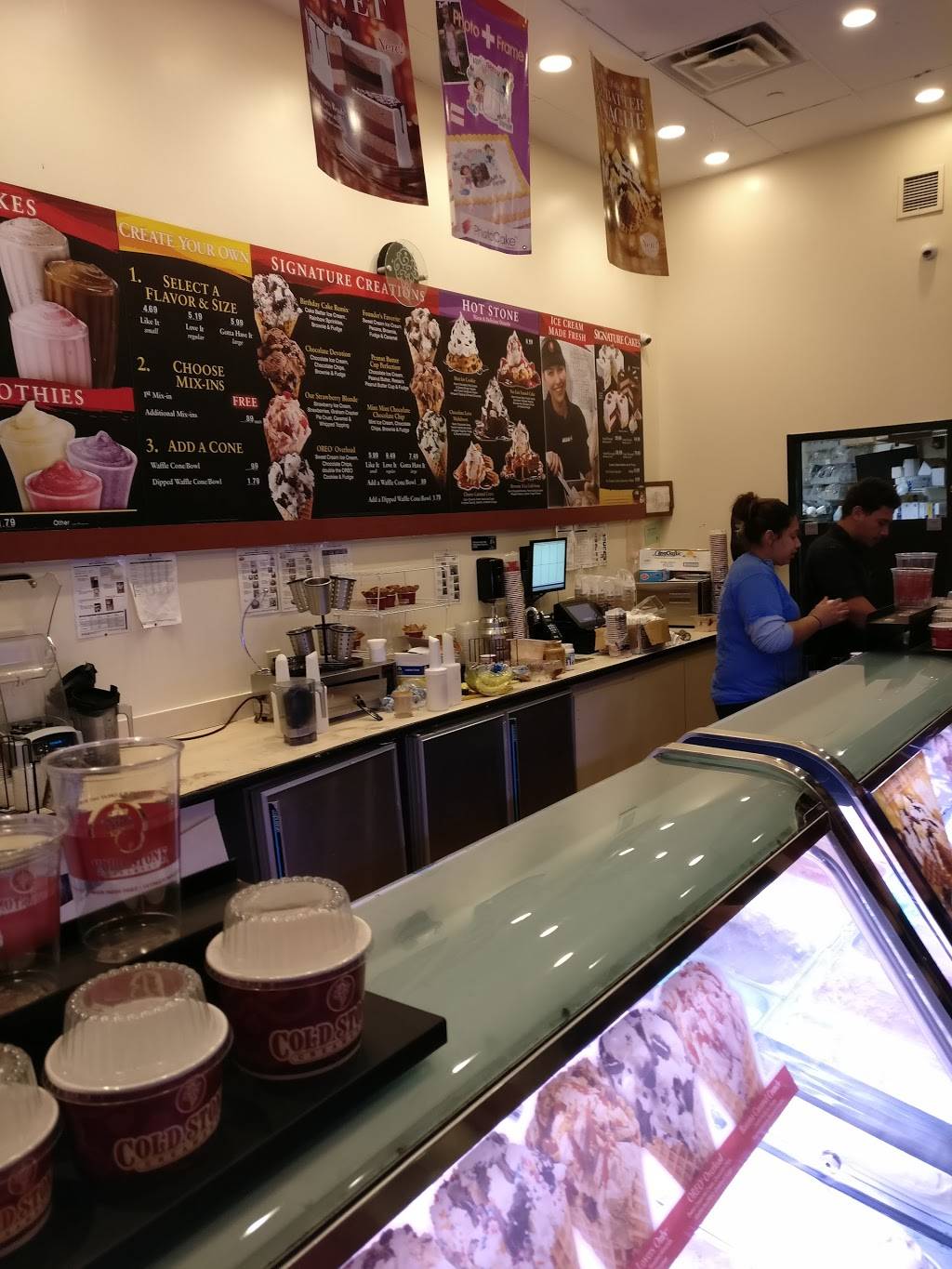 We went here to get the Cold Stone Creamery signature flavor of strawberry blonde and were surprised to see the many flavors on display. All of the ice cream flavors were full, we were able to get the strawberry blonde flavored ice cream. When we went to the Cold Stone Creamery in Howard, they didn't have the signature flavor, they weren't making smoothies and their ice cream and waffle cones tasted stale. The Cold Stone Creamery in Lynbrook had excellent customer service and many many flavors made available to the public.