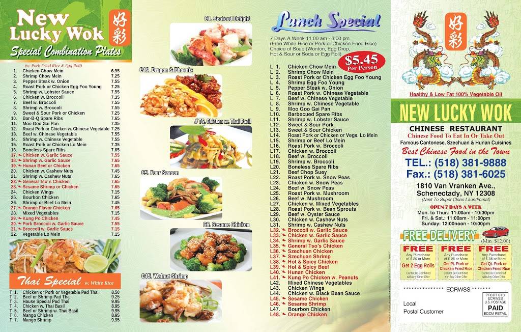 I highly recommend Lucky Wok on VanVrankin in Schenectady County. I live across town from it. However... I have no problem in traveling and passing 2 other Chinese restaurants to reach Lucky Wok. Their food is excellent. The establishment is VERY clean and the people are very nice.