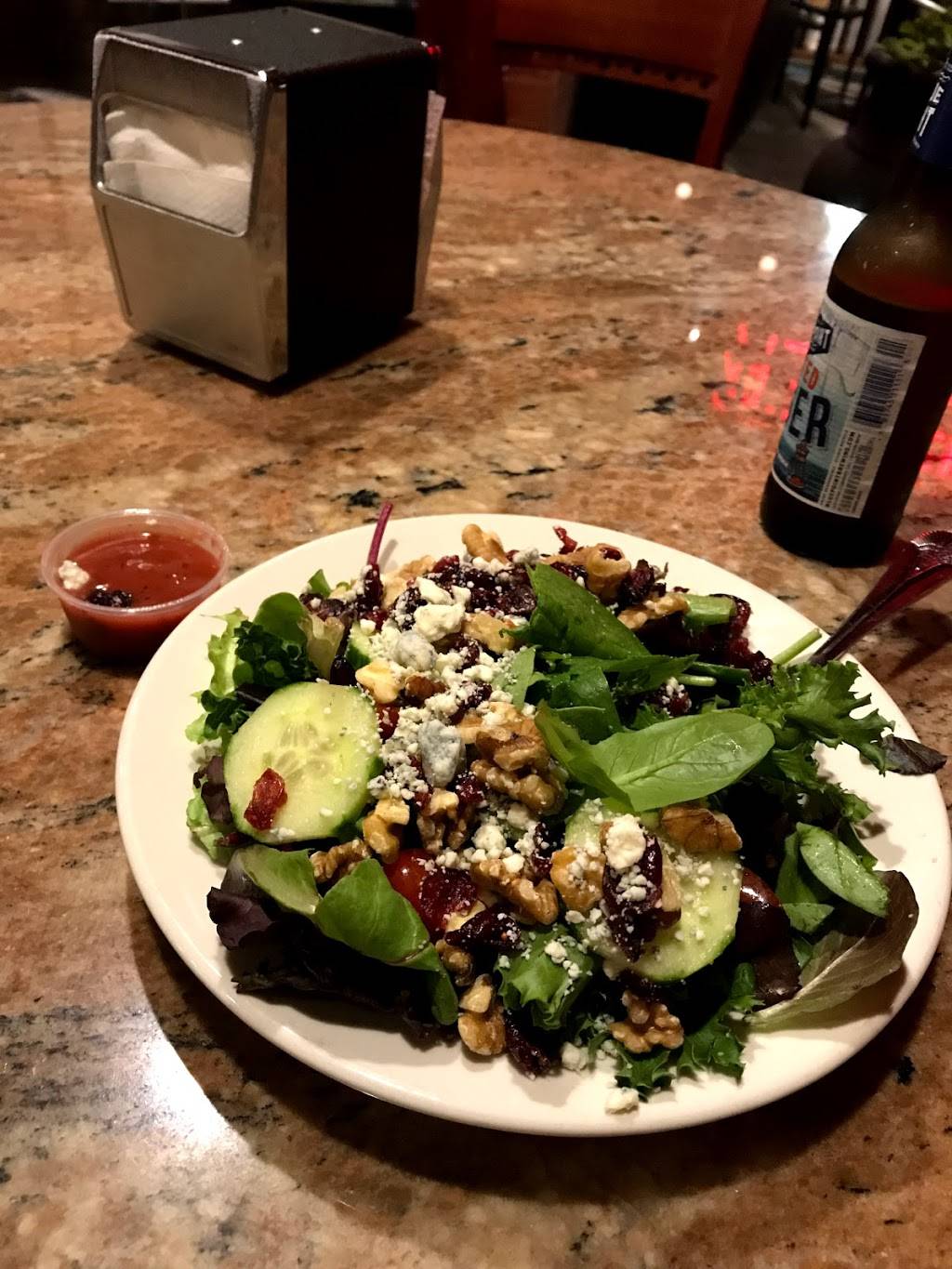 I ordered the wings & a grilled chicken salad. I asked them to add onions & mushrooms to my salad and they graciously obliged. They did forget my grilled chicken & croutons but I called them & they quickly returned with my grilled chicken, croutons & Free garlic knots for the inconvenience. They salad was crisp & fresh. The wings were delicious, the sauce was everything and best garlic knots Ive had in years.