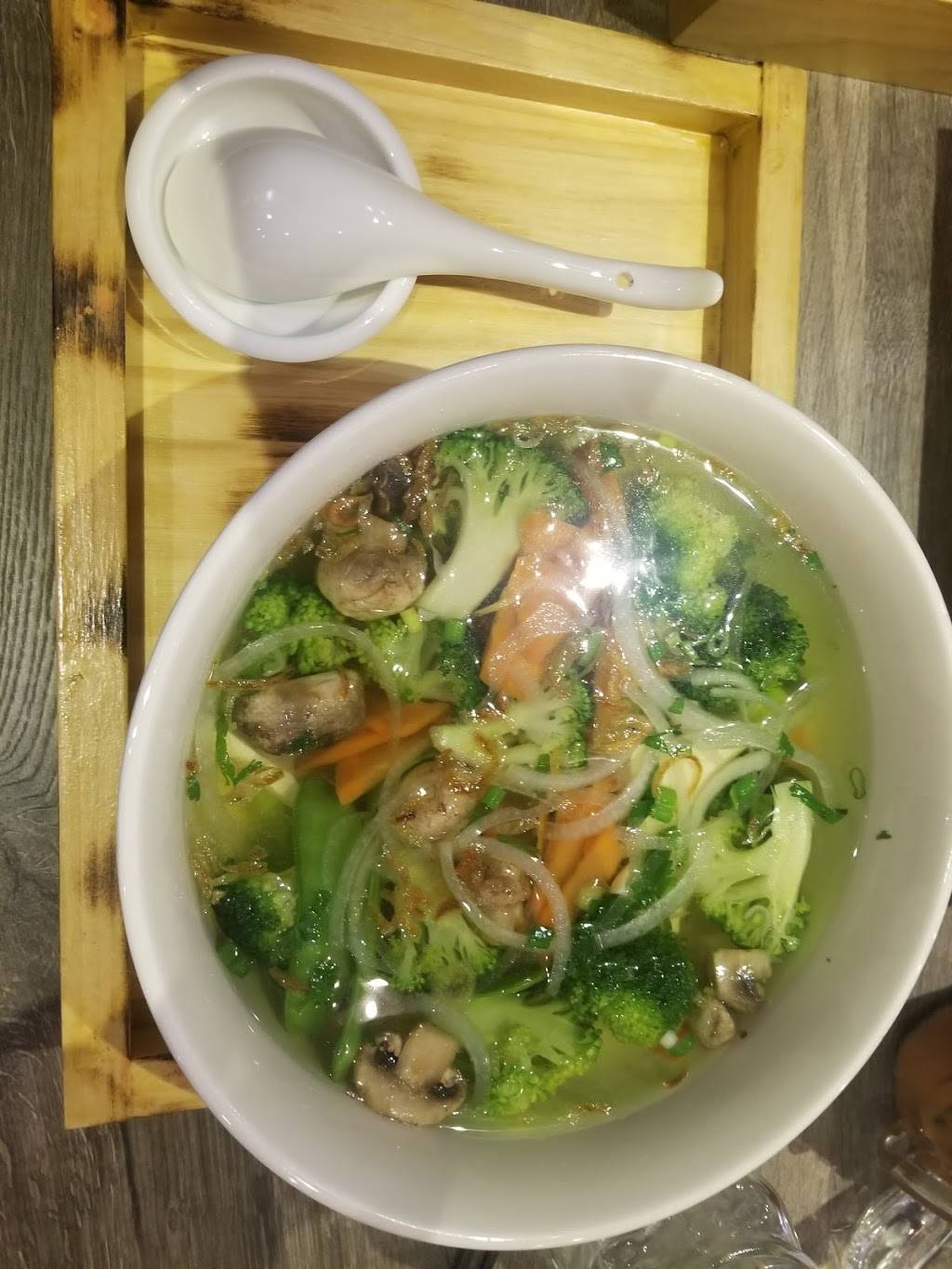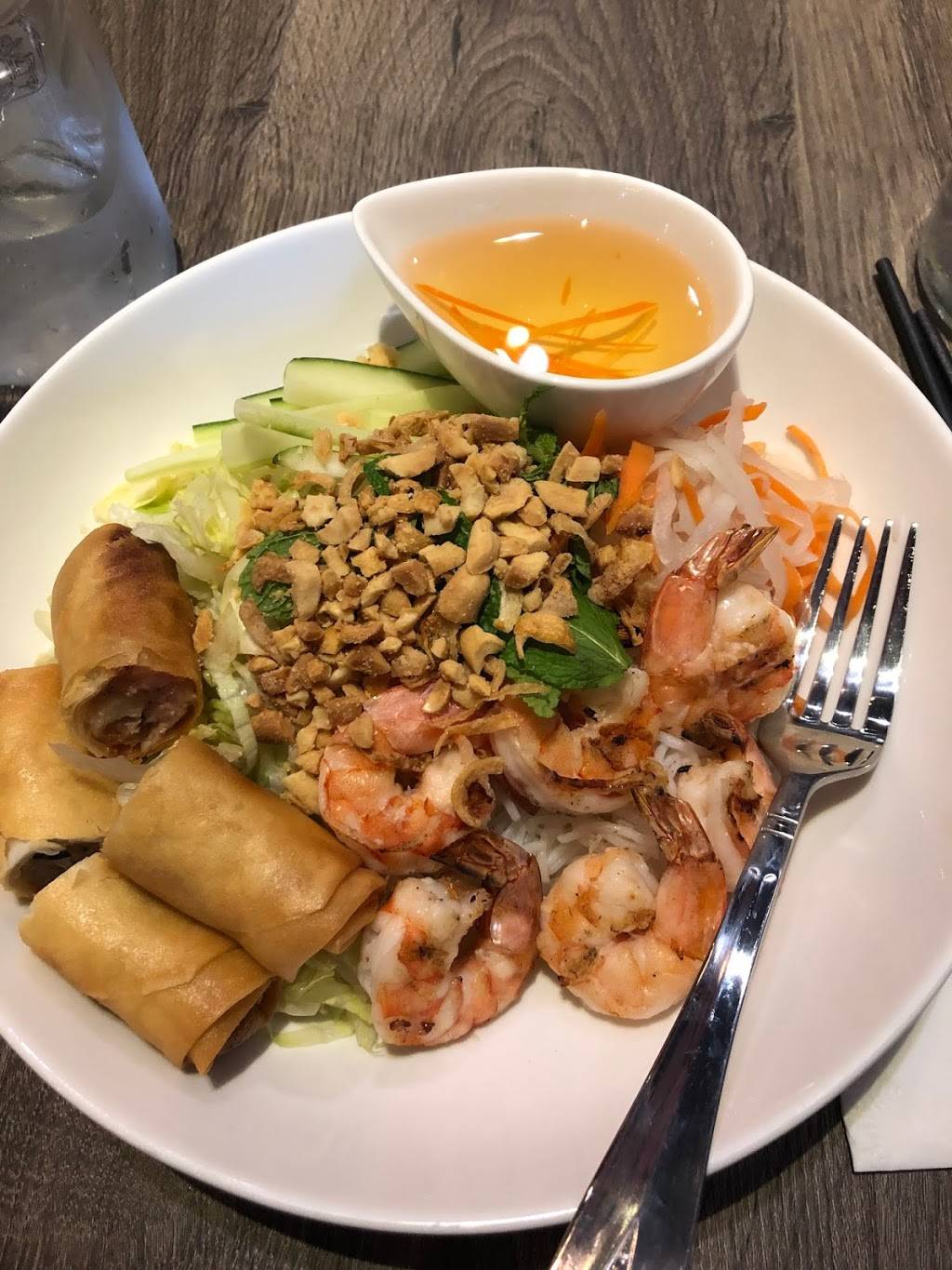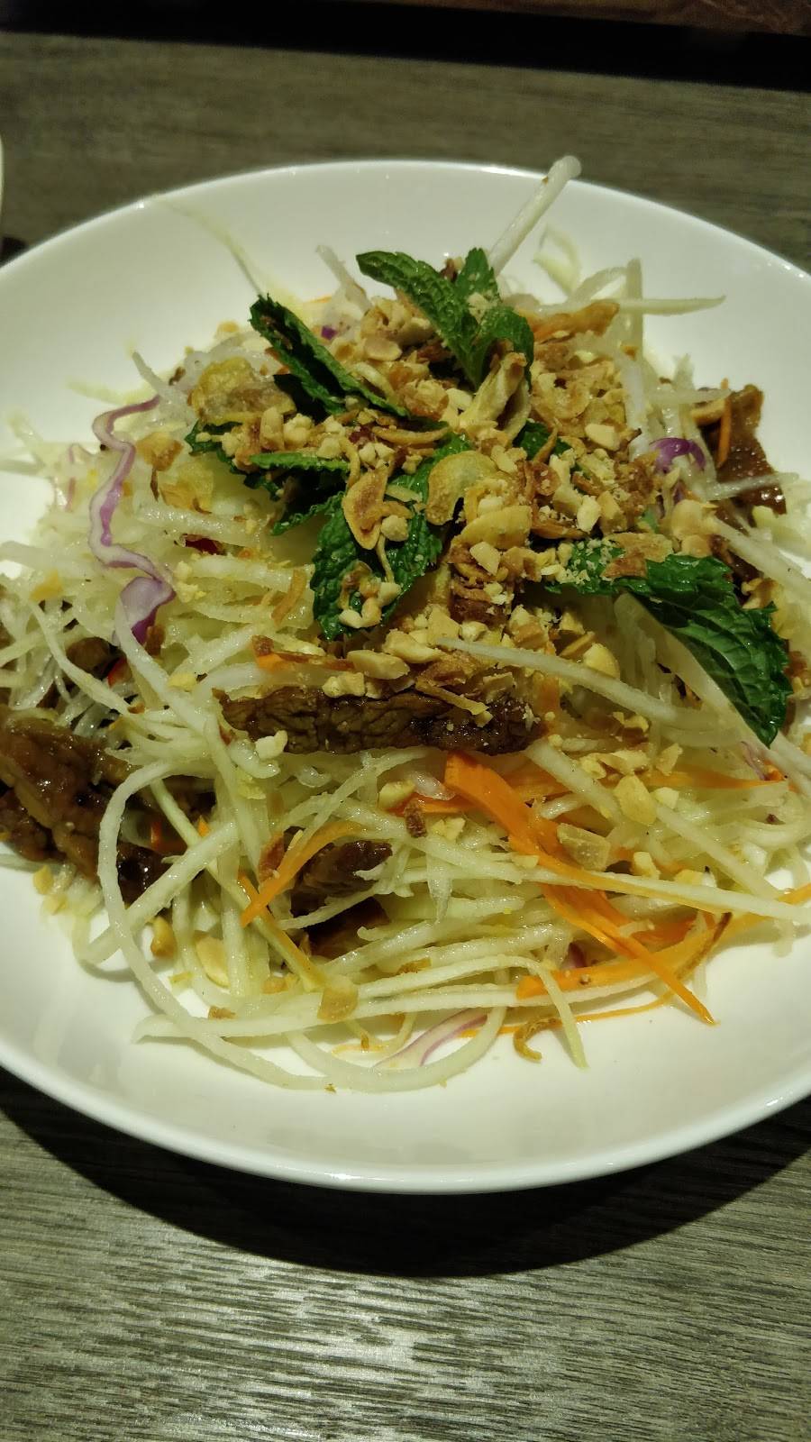 Went there with my husband. We really love this restaurant and it’s actually not easy to find such a nice Vietnamese restaurant in the long island area so want to recommend to all others who stop by this area. The food is very authentic. The Vibes are quite clean, nice and Vietnamese style. The service is decent too so basically we are very satisfied. We ordered 4 dishes which are Grilled Lemongrass Pork Chop, Papaya Salad with Grilled Shrimp, Chicken Broth with Seafood: Shrimp, squid, scallion, crab meat, and mixed vegetable and Vietnamese Steamed Bun with Boneless Spare Ribs. The pork chop is the appetizer which is quite surprising. The meat is tender and dipped with the fish sauce gives you the sweat flavor and good to be the first dish. The Papaya salad is very impressive since we the slices of the Papaya is very crispy and the blend of the salad serves in large amount. The bun is our favorite and with the sauce, and all different vegetables, each bite is yummy. Lastly, we had the seafood Pho noodle. Trust me, this is really huge. We like the broth of Chicken, and there are all different seafood choices and mixed vegetable so from the ingredients it cal tell the amount and the flavor is very good too since the broth was boiled for many hours as told by the waiter. Overall, we love this place and happy to find it in this area. Will definitely come again in future.