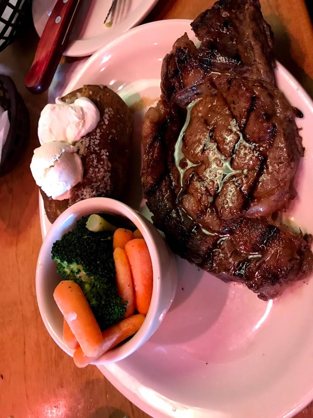 Steak done just as I ordered, very tasty! Baked potatoes and veggies also excellent, the waitress was very pleasant, and accommodating. Typical salad stuff, ice cold beer. Will definitely be back.