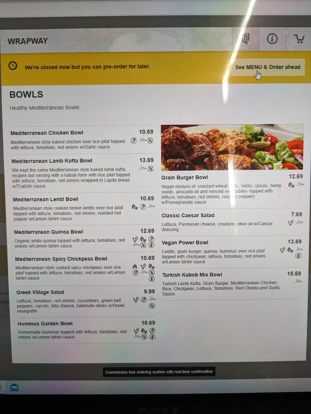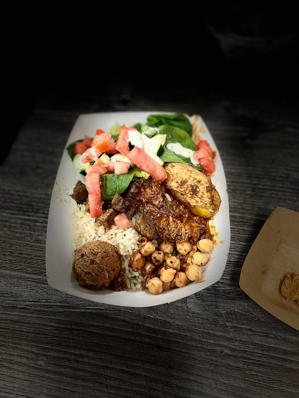 Got a lamb and chicken bowl on a bed of brown rice. Pretty good and portion size was great! I did not add vegetables or salad as they are an additional cost. Owner was super friendly!! He let us try samples before we bought. Go give it a try!