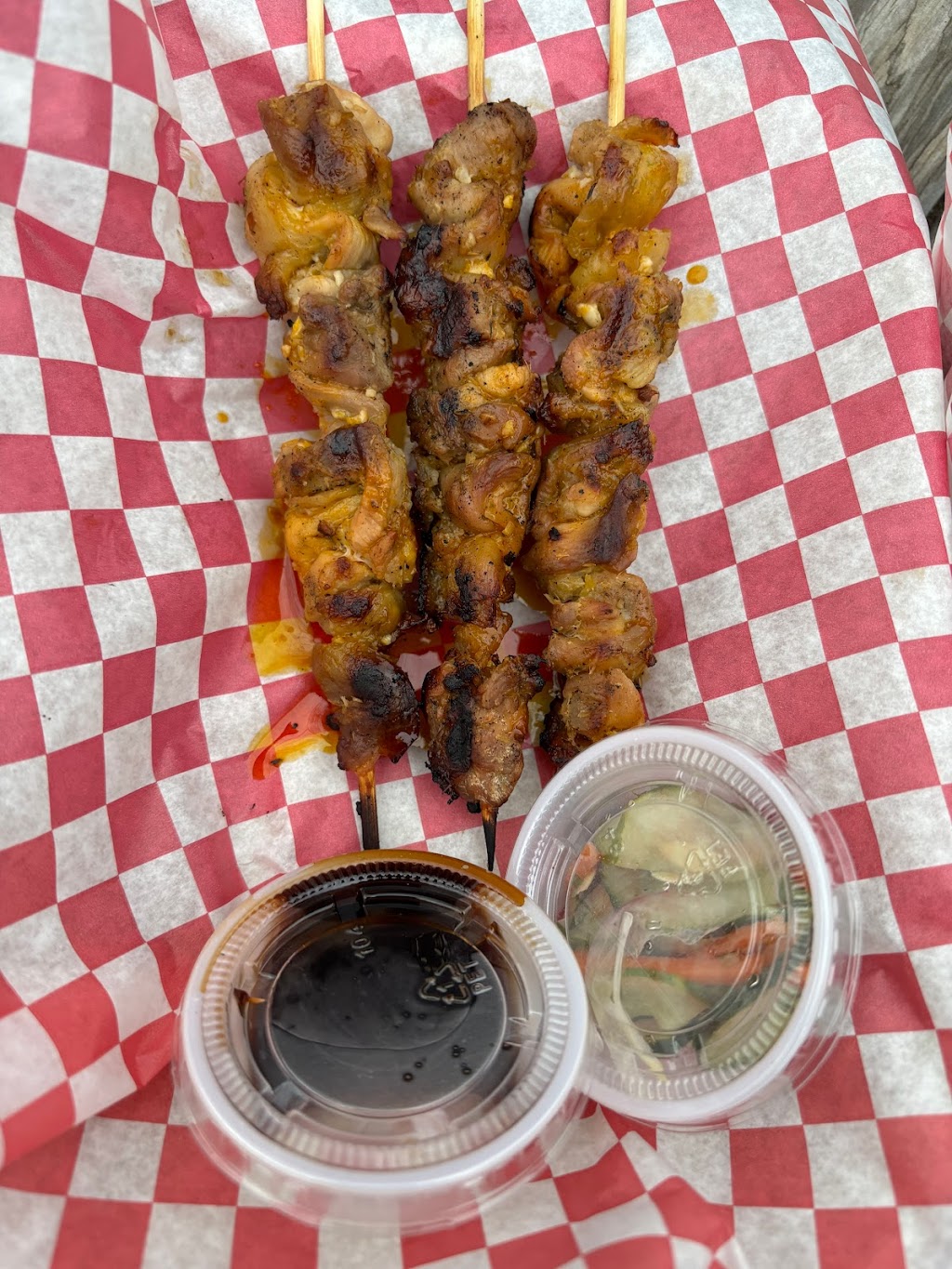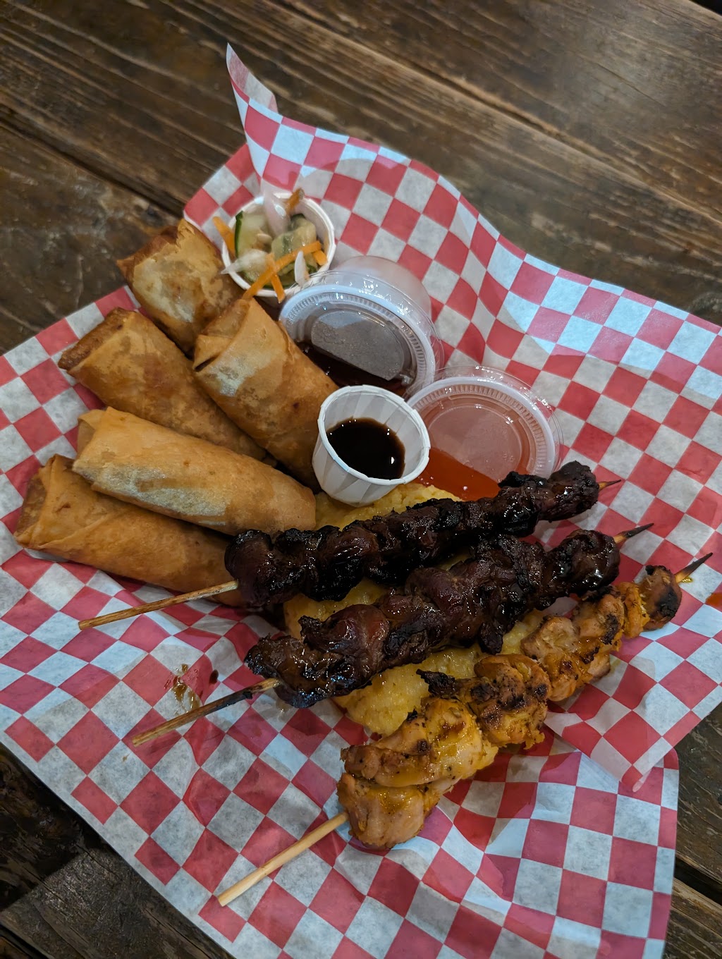 I asked about the menu, and wanted to try the lumpia. I went with the Platter, which comes with 5 lumpia, 3 skewers, a thimble of pickles, java rice, orange-color sauce, brown-color sauce, and soy sauce. It's too much lumpia and not enough of everything else for a shared meal and too much for a single meal.