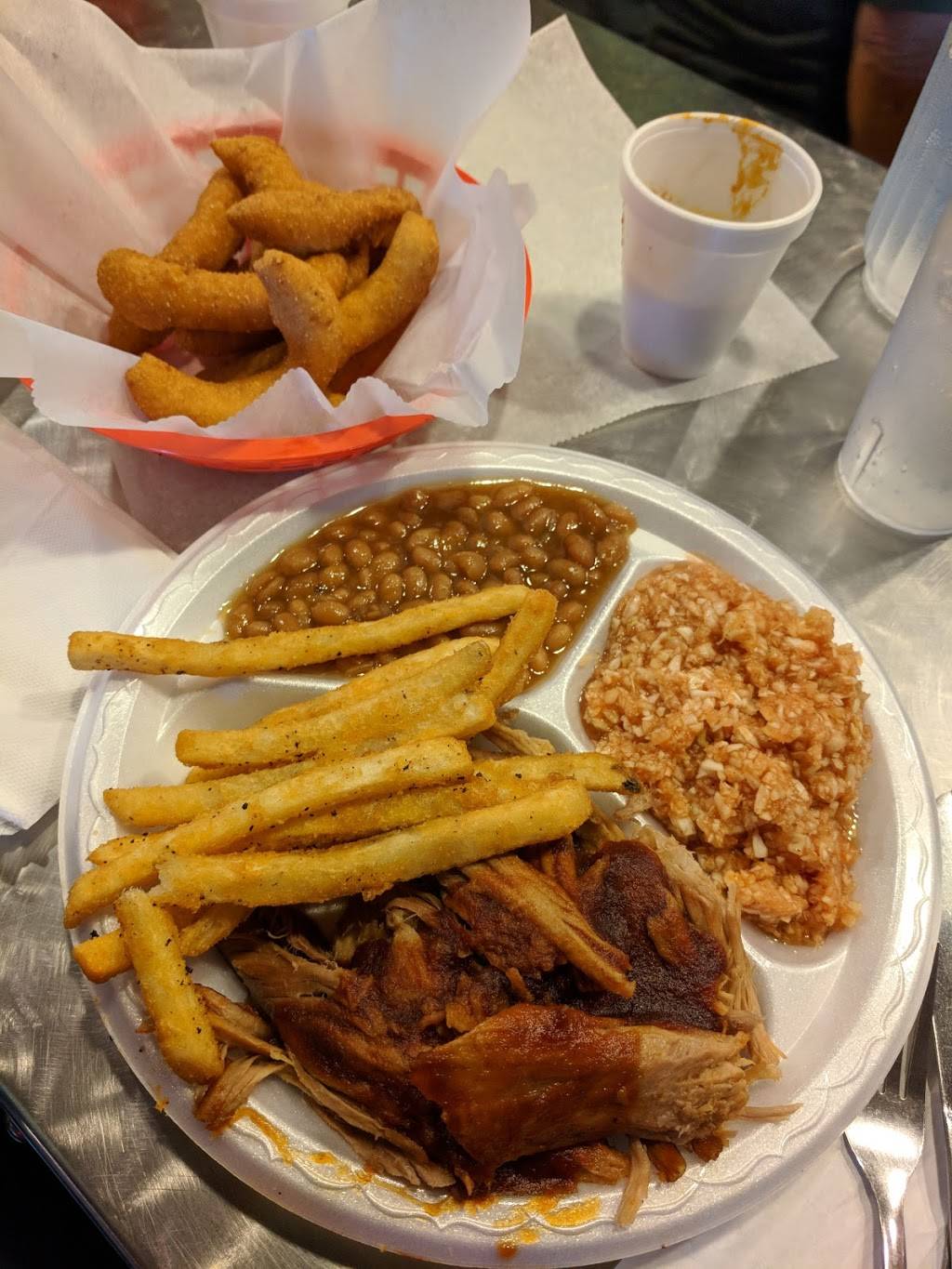 When I first sat down I thought "good god why did we come here?!" And then, our waitress came. My anxiety settled. She was wonderful. She helped us with all of our questions about the menu. We waited about 15 minutes for the food and OMG it was amazing!!! Hush puppies were huge! Potato salad was delicious! And I got banana pudding ???? ugh, so good! My 7 month old was loving that bbq too! 10/10 recommend and I can't wait to come back!