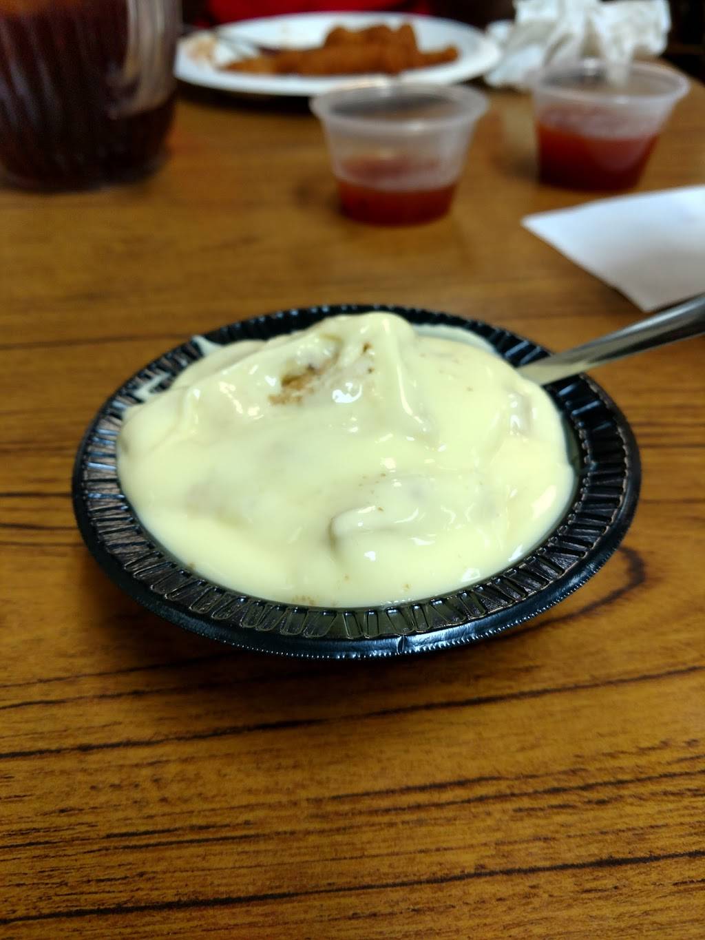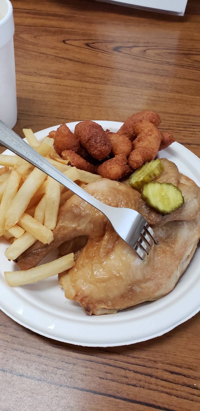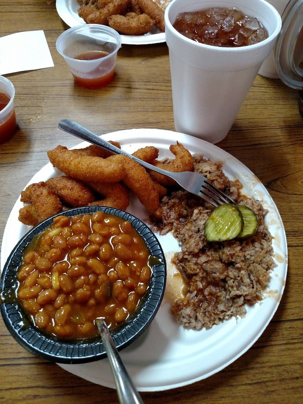 Good barbacue onion flavor hush puppies were ok not my personal favorite. Tea and fries were ok but not great.