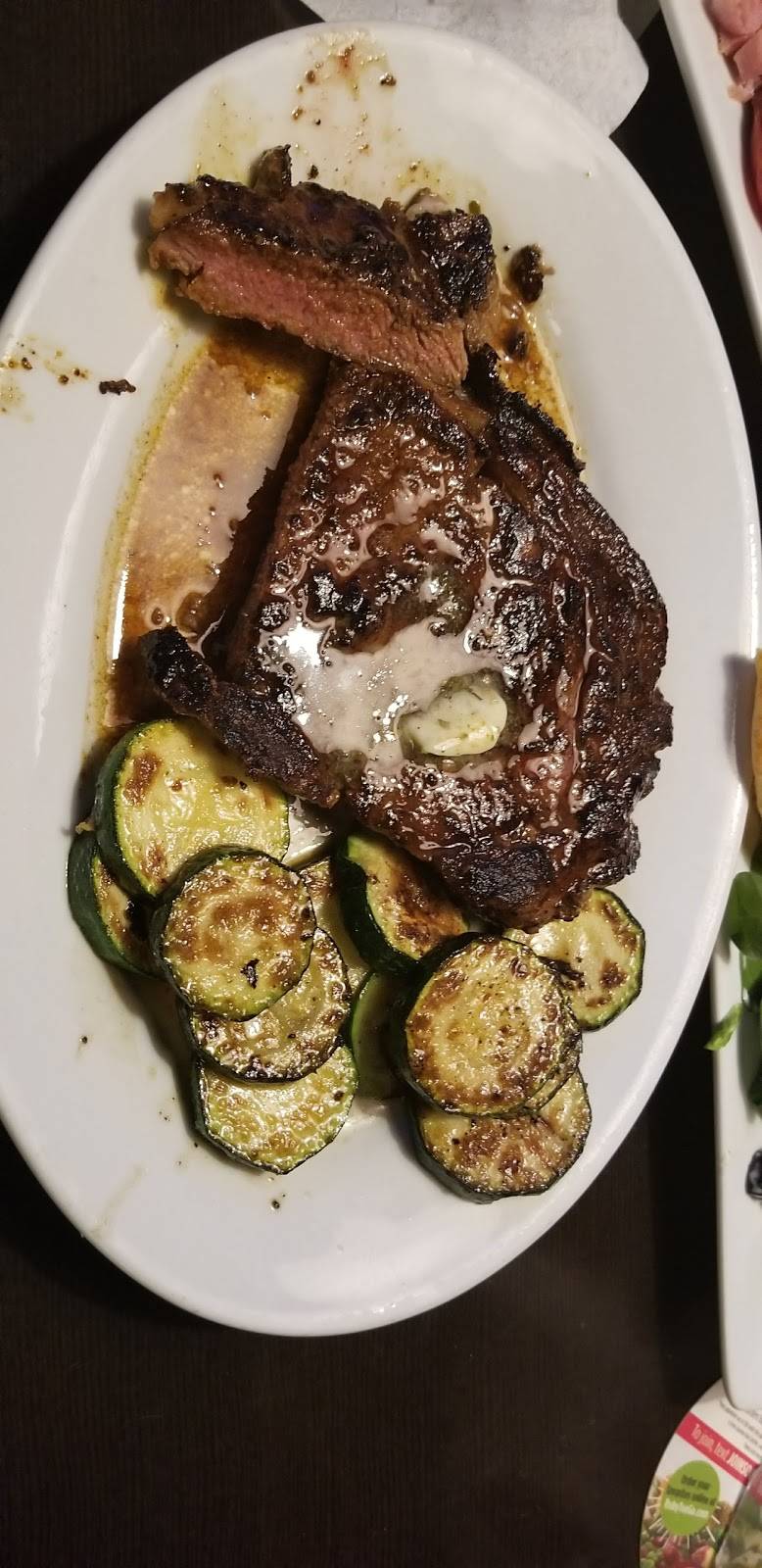 The food was hot , The salad bar with stacks all way to the ceiling , but you get small portions if you order from the menu. The stake had no flavor. For the amount that you receive on your plate too pricey. restaurant is outdated and needs to be torn down, service was good.