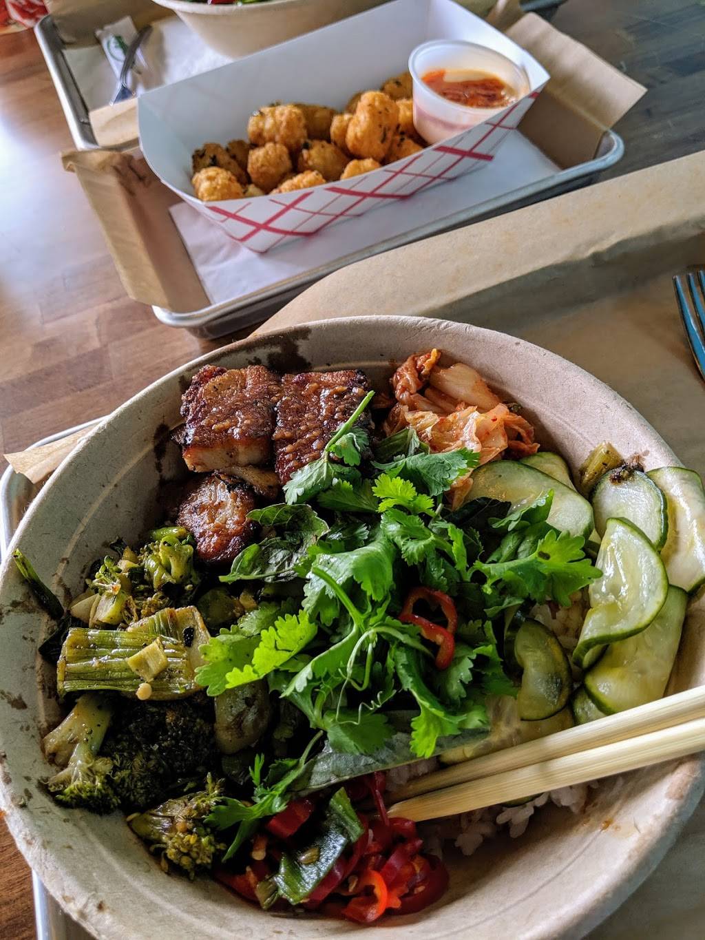 Friendly staff! Very helpful in helping me choose what to eat. I ended eat the chicken sandwich and duck fat tots. It was delicious! Made to order and fresh ingredients. So happy to have this unique restaurant is south Durham.