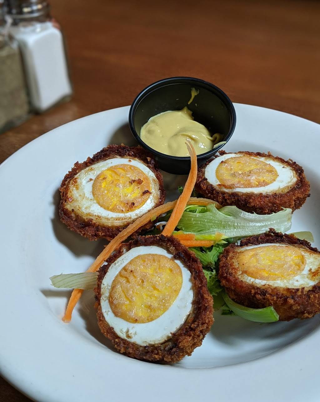 We got their small entrees and they were huge portion sizes. The corned beef and bangers and mash were both delicious. The Scotch eggs were great. I like the mustard that is served with it. The waitress was kind and quickly took our orders. We will definitely come back.