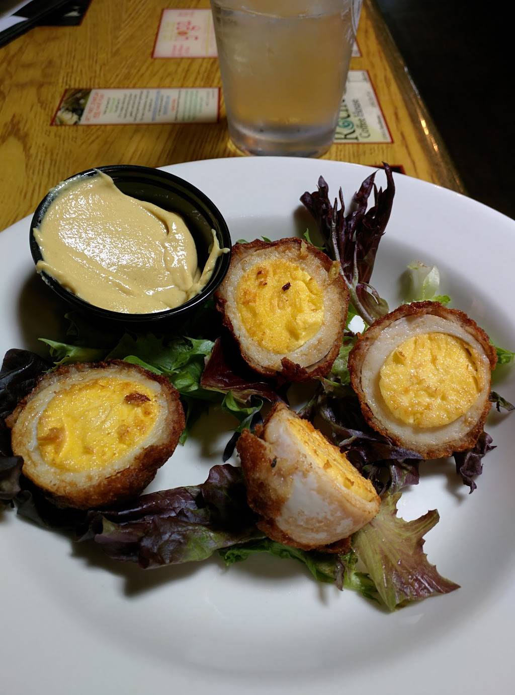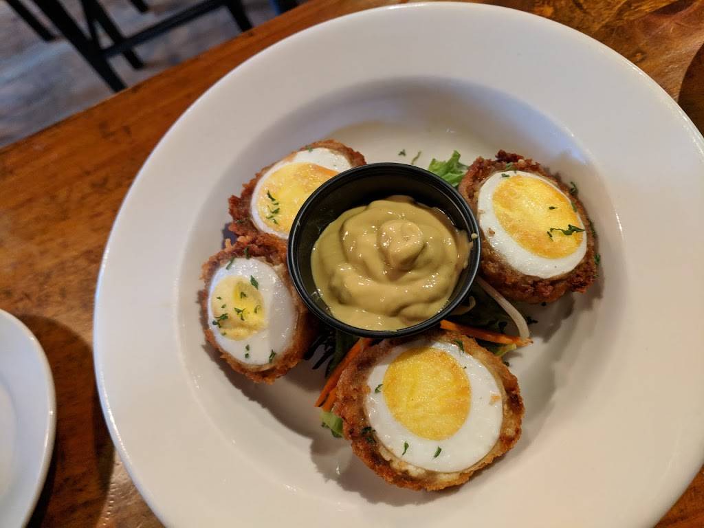 The waitress was very friendly and attentive. The atmosphere was very nice and the restaurant was clean. The menu choices all sounded wonderful. They have a lot to choose from. Everything I had here was very yummy. Most places garnish water with lemon, but they used cucumber. How absolutely refreshing!! The draw to this establishment for me though, Scotch Eggs on the menu!!! Scrumptious!! Can't wait to revisit!