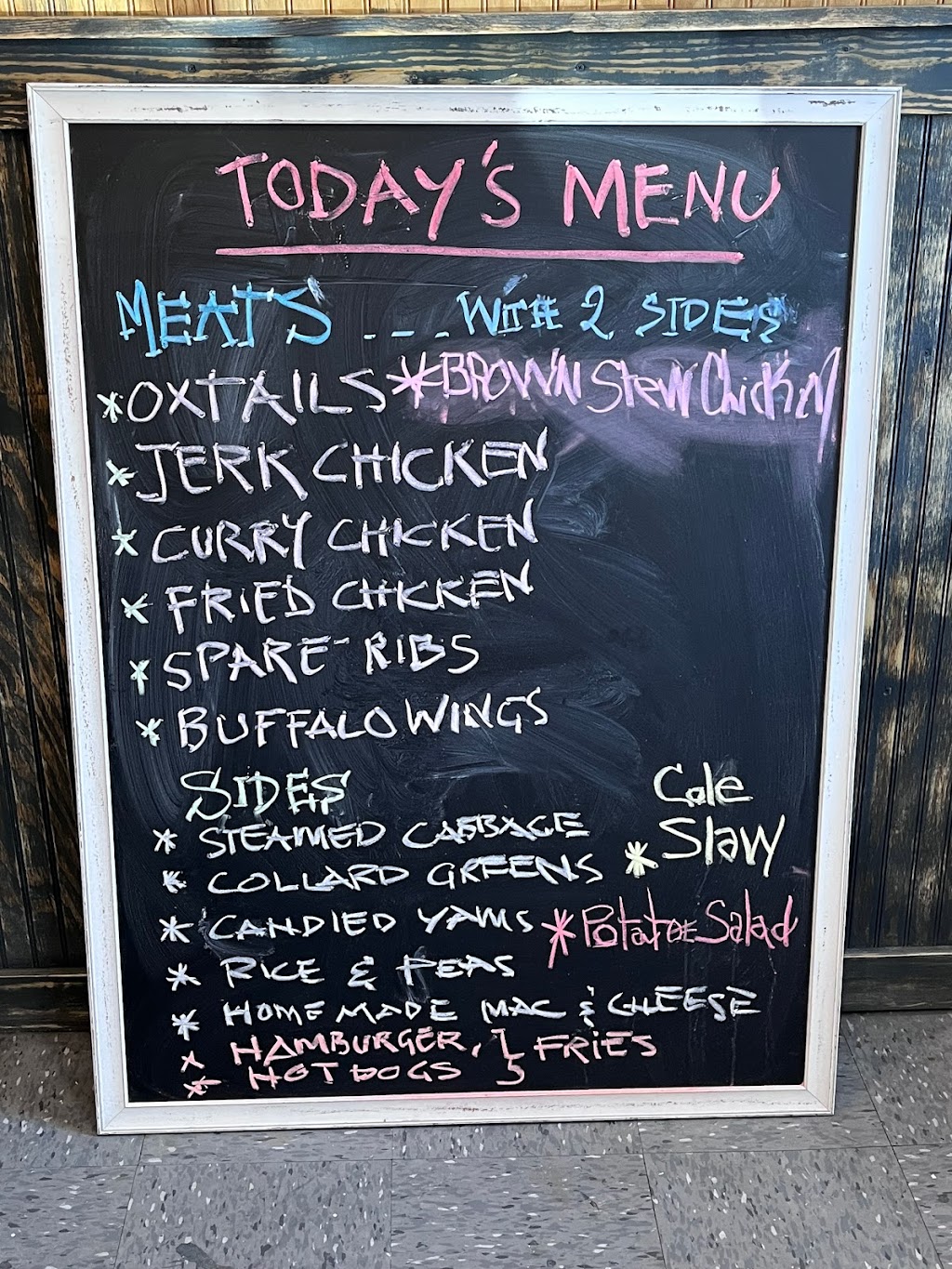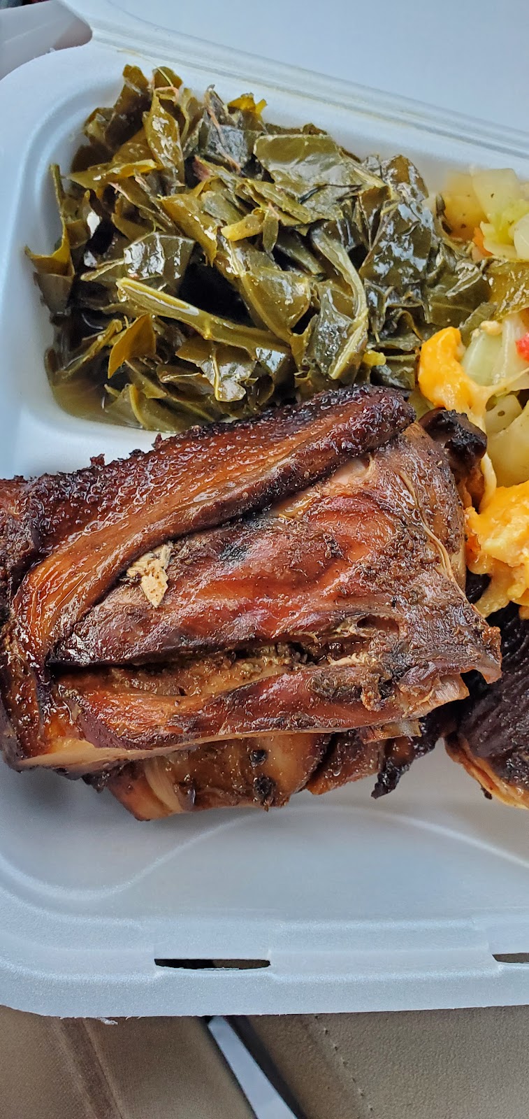 I visited on my way home from work. This is a counter serve restaurant only. No frills but nice and clean. The Food was pretty good and I was pleasantly surprised considering reviews. This is their 3rd day open so they explained why prices on menu list missing. The chicken is smoked. I think important to note that because if you don't know or haven't had smoked meat you'll be surprised. Smoked jerk chicken cooked by wood fire to be clear. Collards and cabbage very Flavorful and Mac and cheese is homemade 😋 all delicious. Try the sweet tea. Arnold Palmer style. I will be back. Much success in your new take out restaurant.