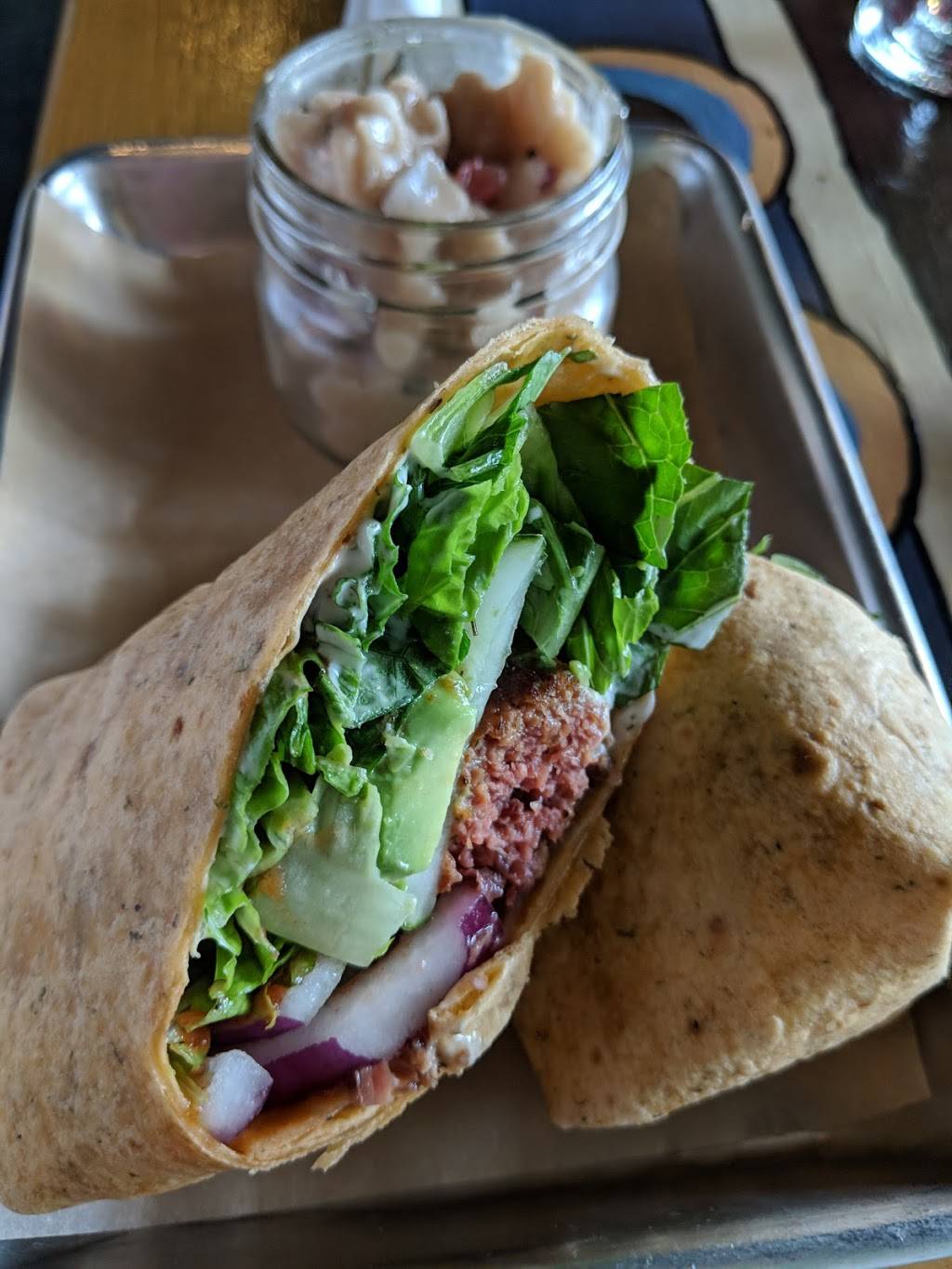 Interesting menu. Good choices for vegetarian and some choices for vegan. Food is very fresh and prepared when it is ordered. I had the bean burger, which was tasty, but did not like the bread slices that made it difficult to eat. Restaurant is small but was not crowded sltjough a steady stream of customers came in.