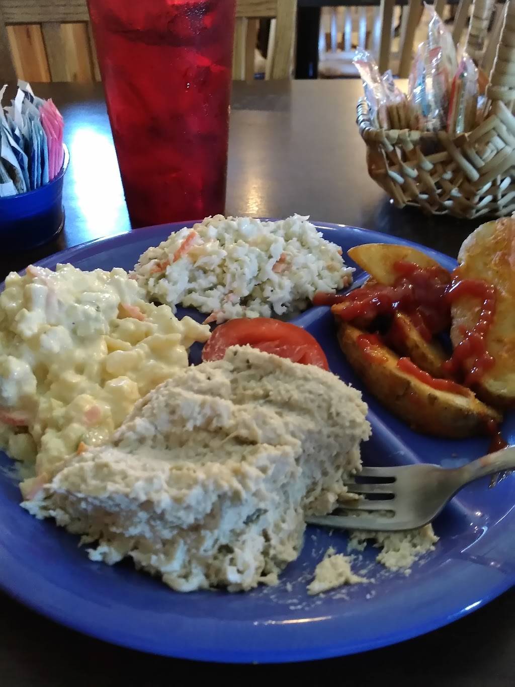 We had chicken salad with potato salad and a crab cake. The Cole slaw is awesome.