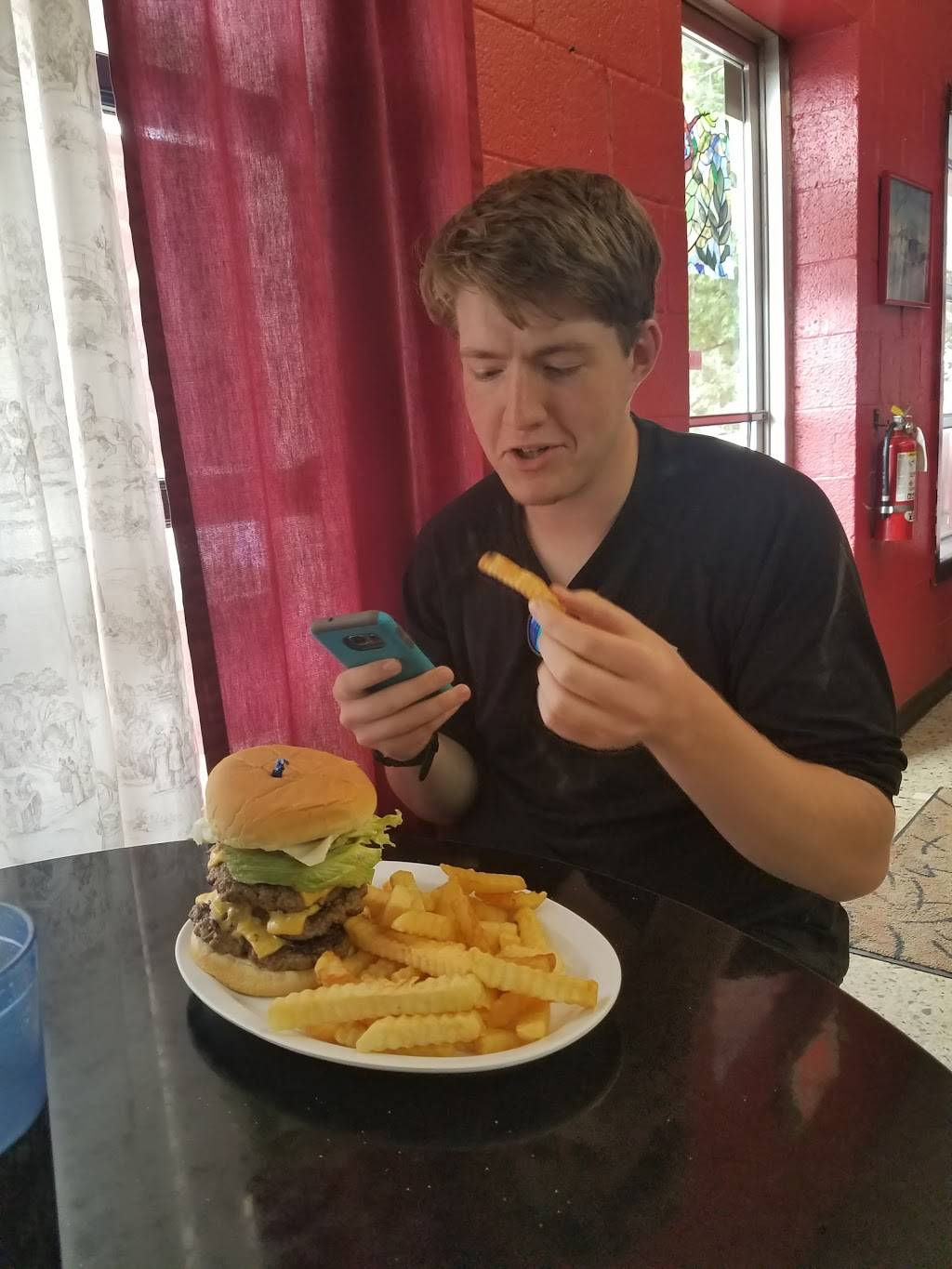 Small mom n pops. Not much to look at but great food. Try their largest burger, 3- half pound patties on a bun fixed your way. Out in the boonies but worth the drive.
