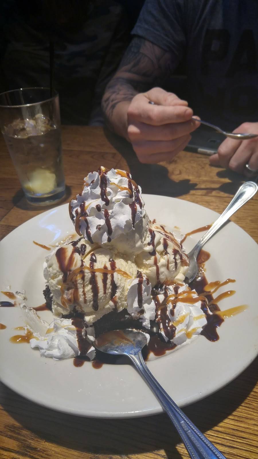 The service was good despite the fact they were very busy. I had the pulled pork sandwich but there wasn't any sauces to put on it. Atmosphere was great.
