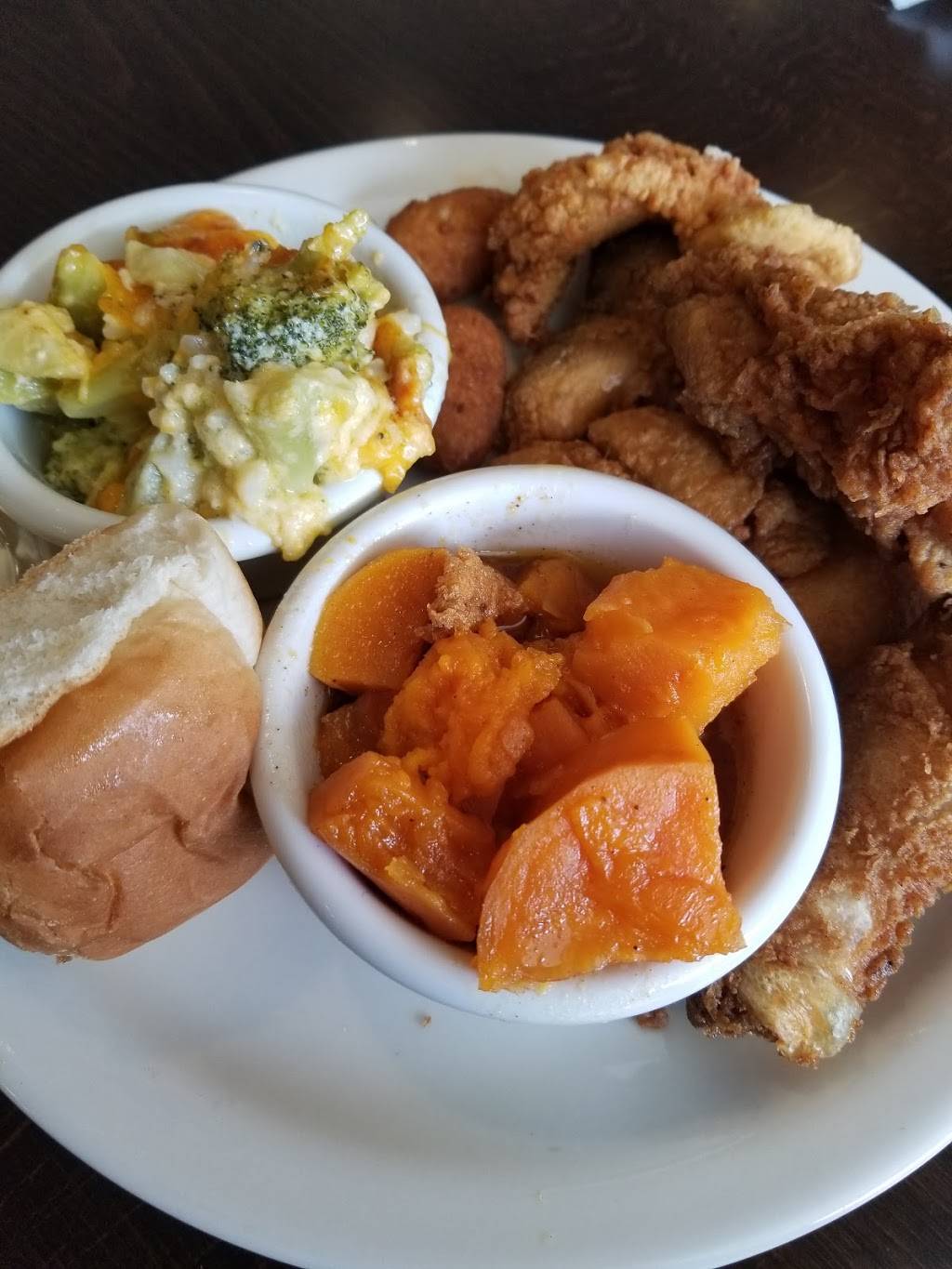 Food was awesome. Service was great. Music was good. Super close to the house so we will return. The candied yams and collards are the best part... so yummy. Glad it's close enough for us to go back again and again.