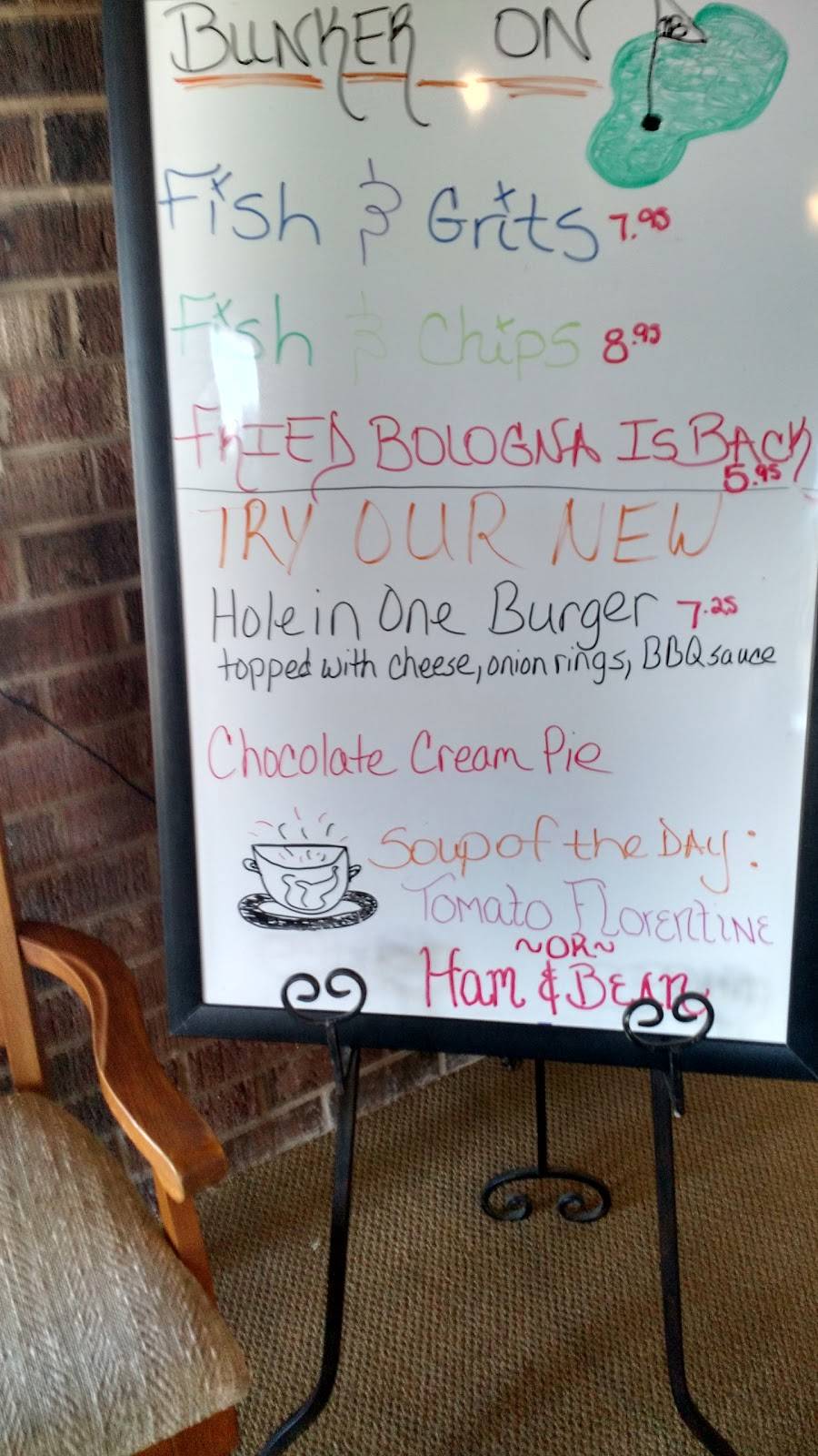 Now called Bunker on 18. Pleasant with great overlook of golf course. Our favorite breakfast (all day) of fried fish, eggs, and good grits for two at $26