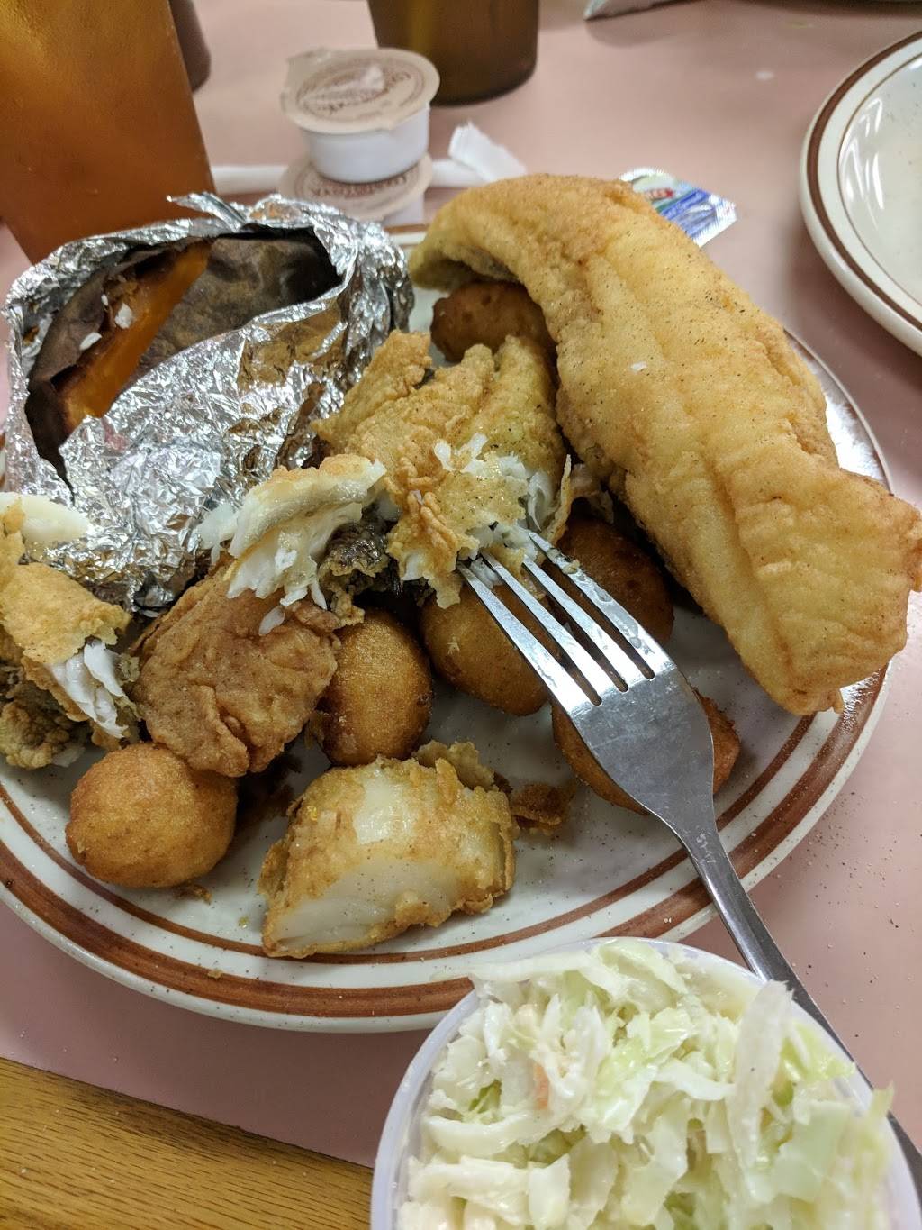 Tons of food on the plate so much so it's hard to eat it all in one sitting. The food was good. My hubby is allergic to catfish though and got chicken tenders. He started feeling sick so not sure if they fry fish in some oil as other products. We didn't think to ask and should have.