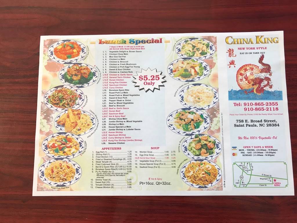 Saint Pauls only have a two chinese restaurants on the town. China King menu is pretty good and their food is great. Very friendly environment. They always treat me great. I always call my food in and it's always ready.