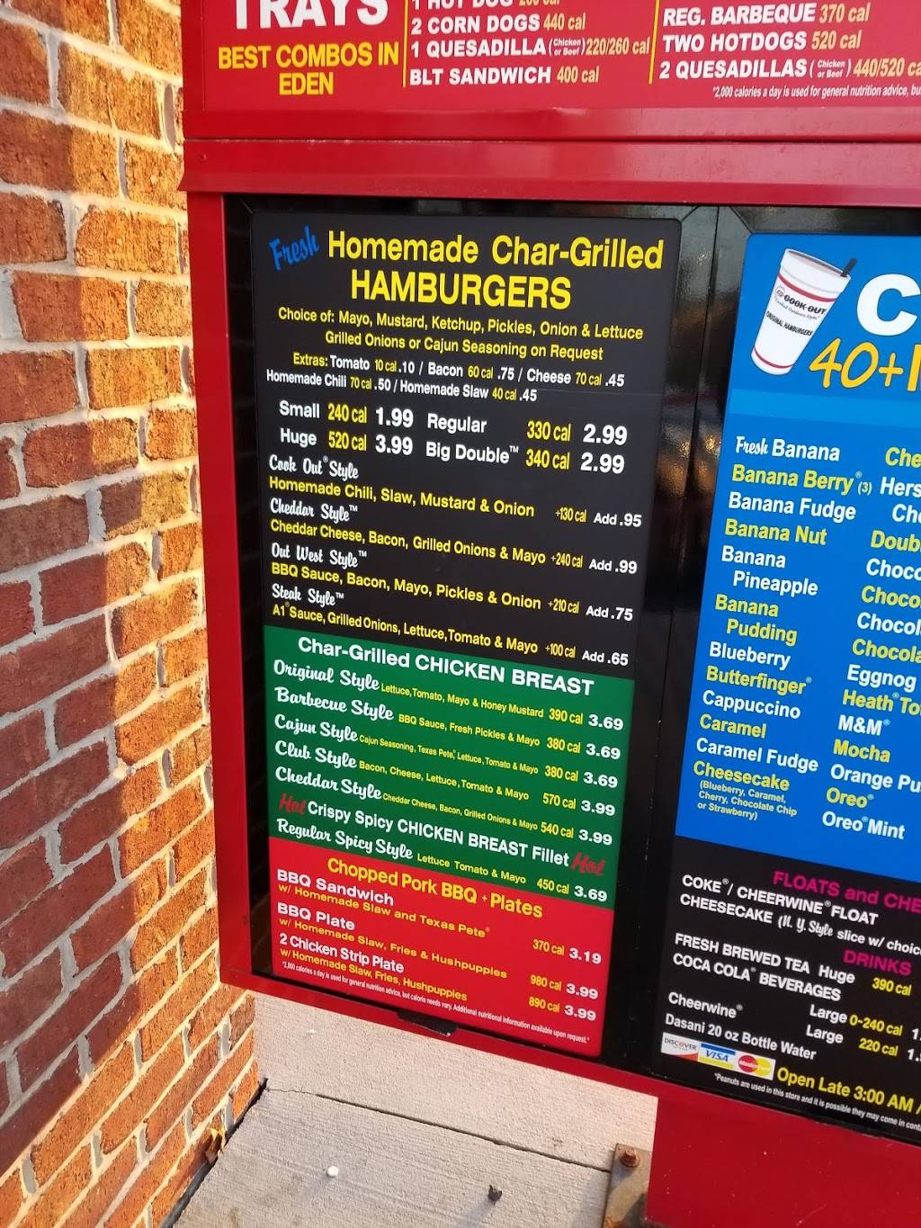 If you want a hamburger fixed the old fashioned way then this place is for you. I ordered a cheeseburger which had the sliced onion, chili and mustard. It had the grilled taste you love and was piping hot. It's a drive around burger joint (2 drive around lines going at once) but service is quick. They also have BBQ, hot dogs and a good variety of other items on their menu. This location does not offer inside seating. When visiting Eden I always make sure to get a Cook Out cheeseburger.
