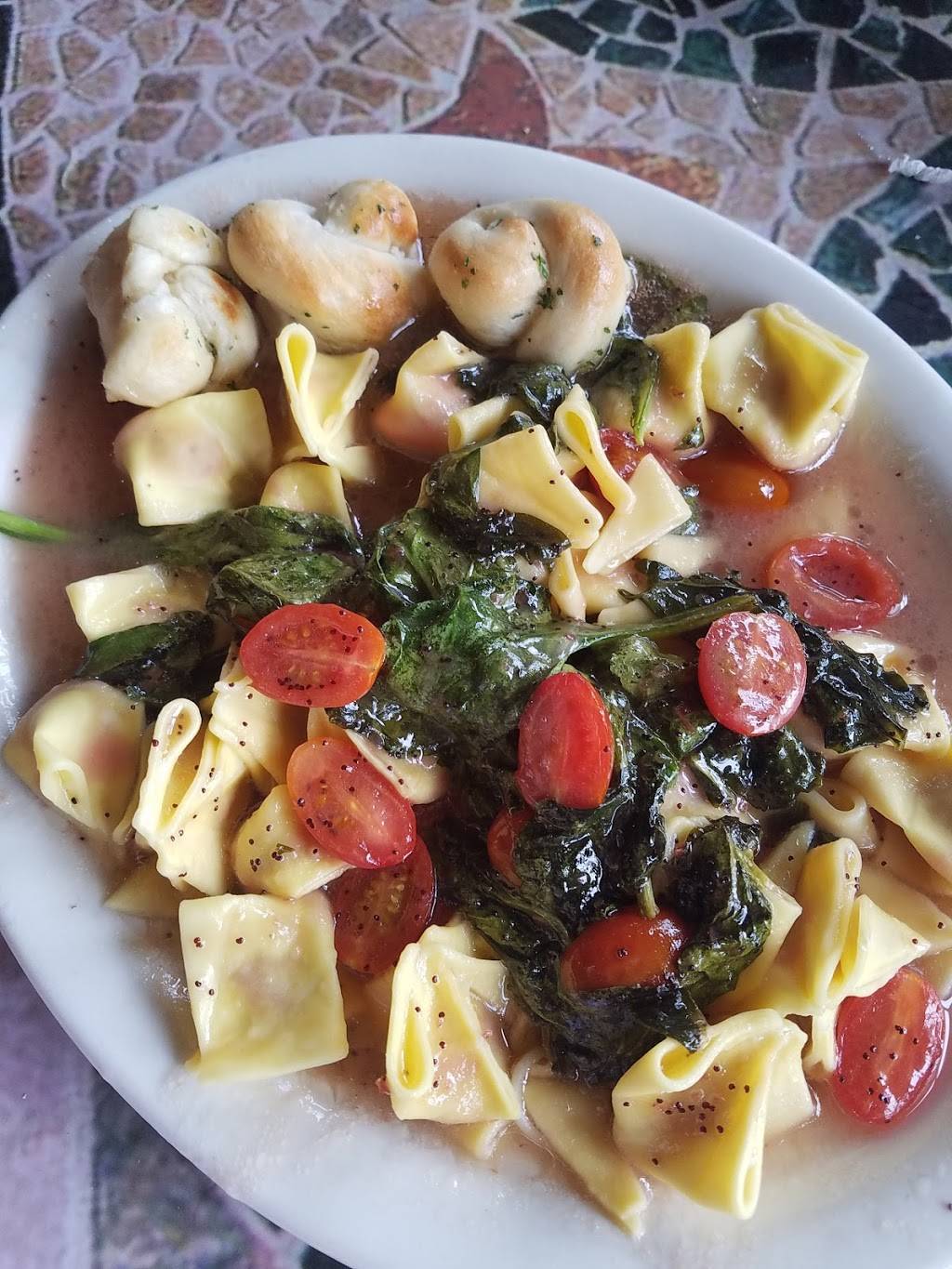 My wife and I ordered takeout in the early evening on a Saturday. I selected spaghetti with a side salad; she ordered a large garden salad. My portion was small and the sauce was thin. The bread was reminiscent of baked pretzel dough, and it was just tossed on top of the spaghetti. Her salad was lettuce with two slices each of tomato and cucumber. The onion, black olives and shredded mozzarella were more plentiful. My side salad had roughly the same distribution of vegetables as her large salad.
