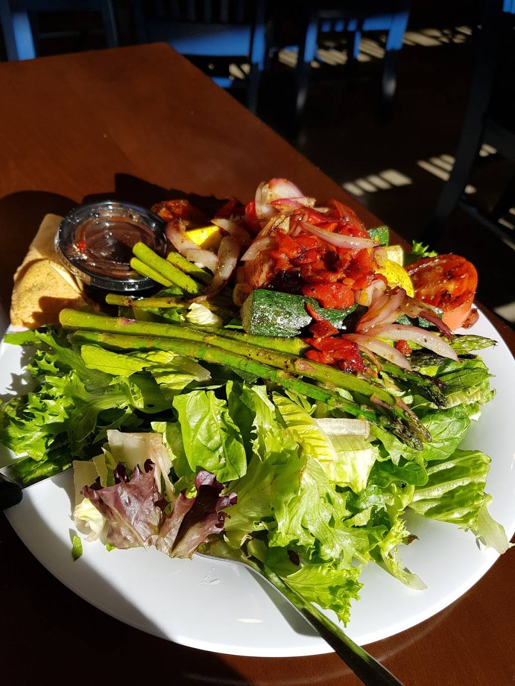 Really liked the Cary location so was excited to try the North Raleigh location. They really did a nice job opening up what was the rather dark former bar. We got there on a weekday just as they opened, so we were the only diners. I had my usual grilled chicken roll with double tomato cucumber salad. Fantastic. My wife had a great Mediterranean salad that she enjoyed. Fresh food. Just hope this location makes it.