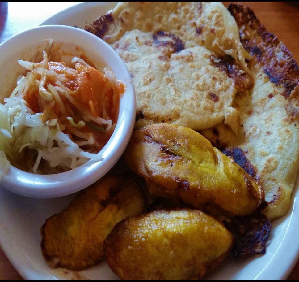 Pupusas are these thick, little corn tortillas that are filled with some kind of mild cheese and cooked slightly crispy on a grill. They're moist, tender, and delicious. They also have fried plaintains that are similar to banana slices but slightly more dense and less sweet.
