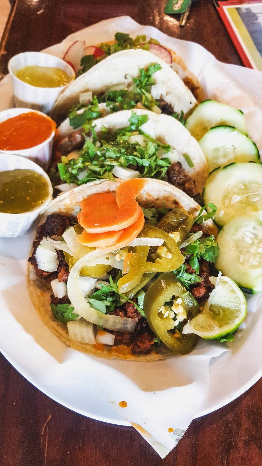 Perfect experience! The atmosphere when we walked in was exactly what I was hoping for in an authentic Mexican taco experience. It was warm (no a/c?) but had large fans keeping you cool. Modern Mexican music playing, folks at the bar laughing and having a good time, and of course the DEEEElicious tacos! I got the steak/mexican sausage tacos (only 2.29 each) and got them maybe 7 minutes after ordering. Here, you can put your own toppings on by bringing it to the little topping station. I loaded mine with onion and cilantro. Man oh man. So good. I love those corn tortillas. The rice was good too. I can't wait to go back honestly.