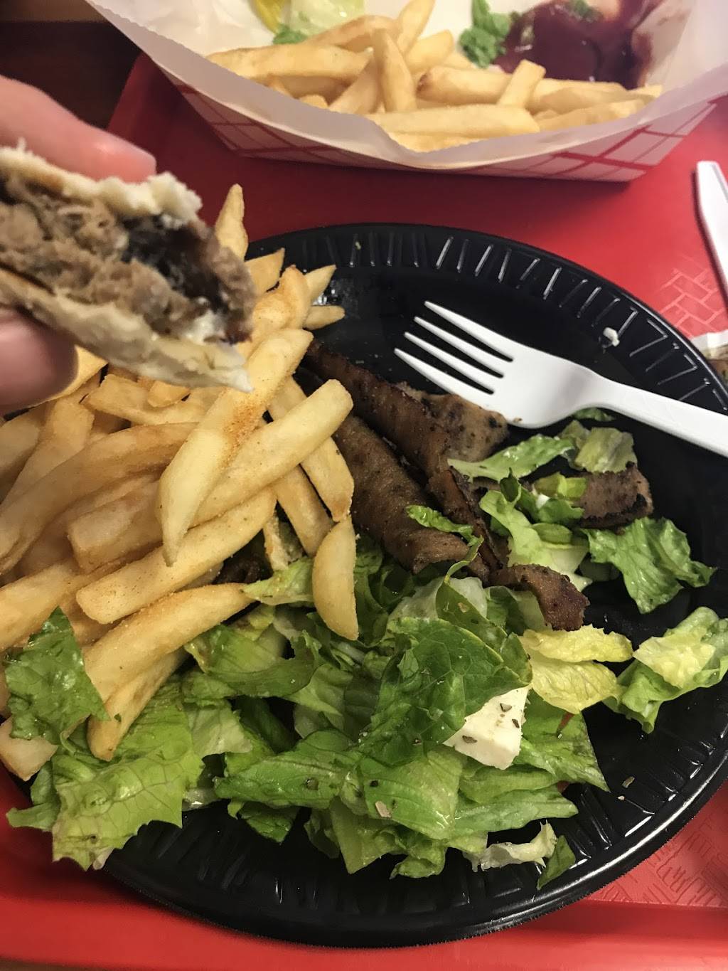 This place smells great and is a wonderful place for fans of meat. I ordered to go a lamb pita sandwich and a great Greek salad with pita bread on the side and lamb across the salad with a balsamic dressing. Prices very reasonable and the pita was stuffed with soo much meat. I love this place and the staff and owner were very friendly.