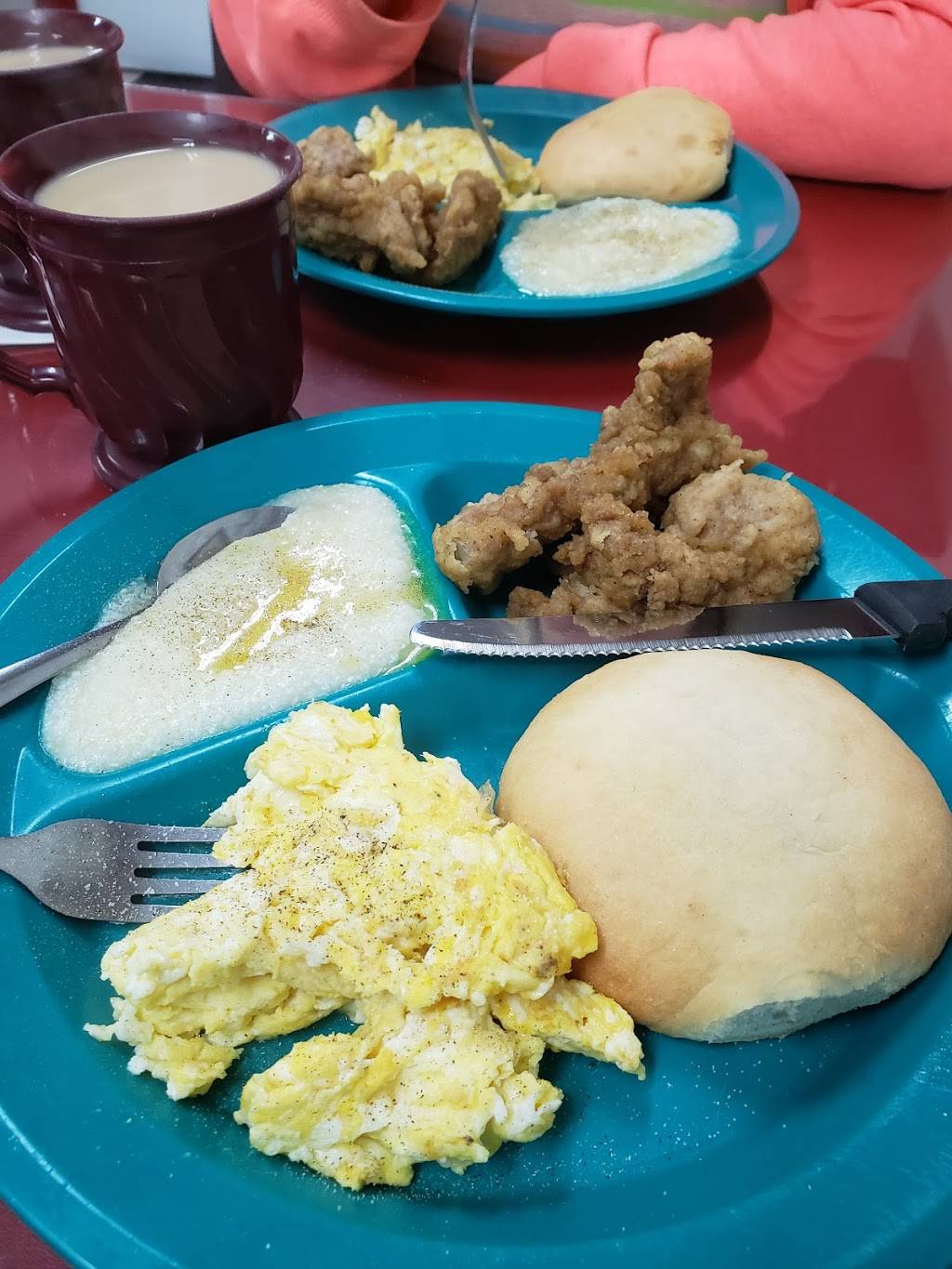 Friday lunch is great. Fried filet of flounder, boiled potatoes, slaw and hushpuppies. Breakfast is great here as well. All home cooking including homemade desserts. Limited seating during peak hours.