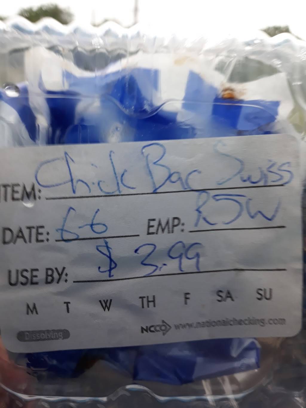 Stopped in today at 15:38 and picked up a Chicken Bacon and swiss Sandwich. It should've been named Chicken Bacon Mess" the bread was way to hard and the chicken was very chewy. It was inedible. Make sure you get them fresh and not for the heated table.