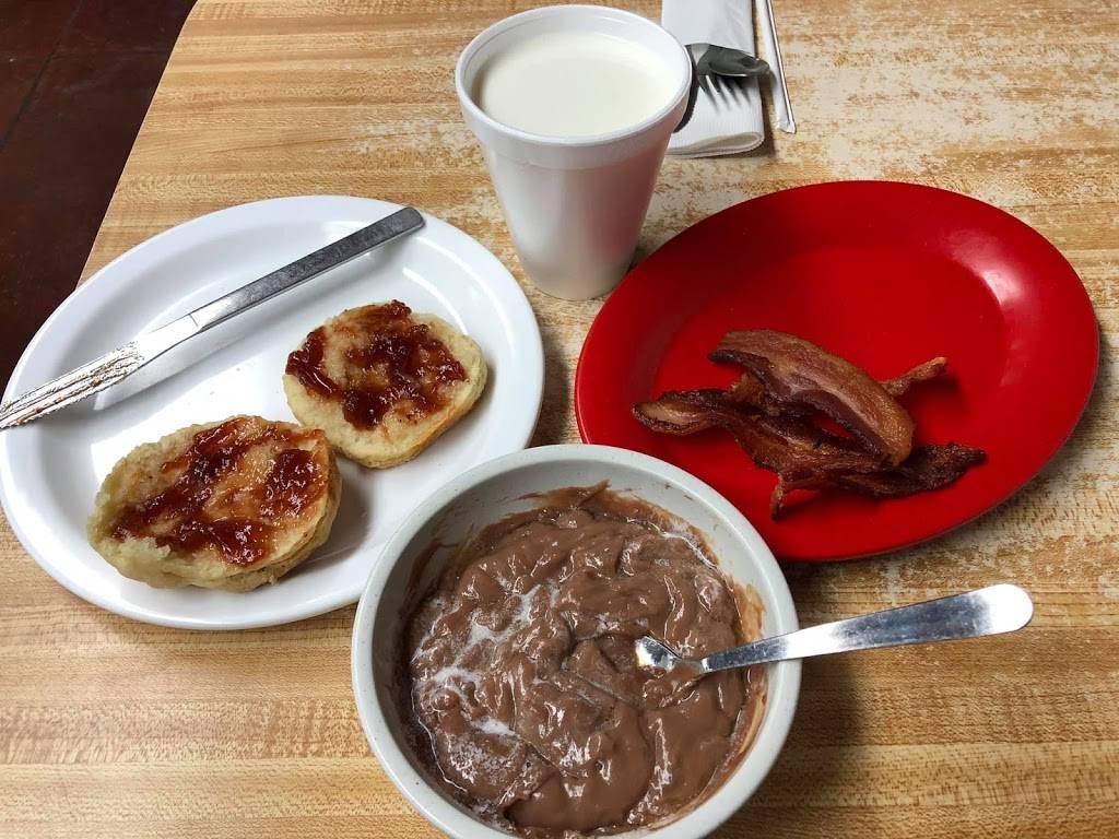 Homemade Chocolate Gravy, bacon, homemade biscuit with strawberry jelly and milk. The perfect breakfast! Amazing food, fast service. Great atmosphere and friendly staff and owners!!