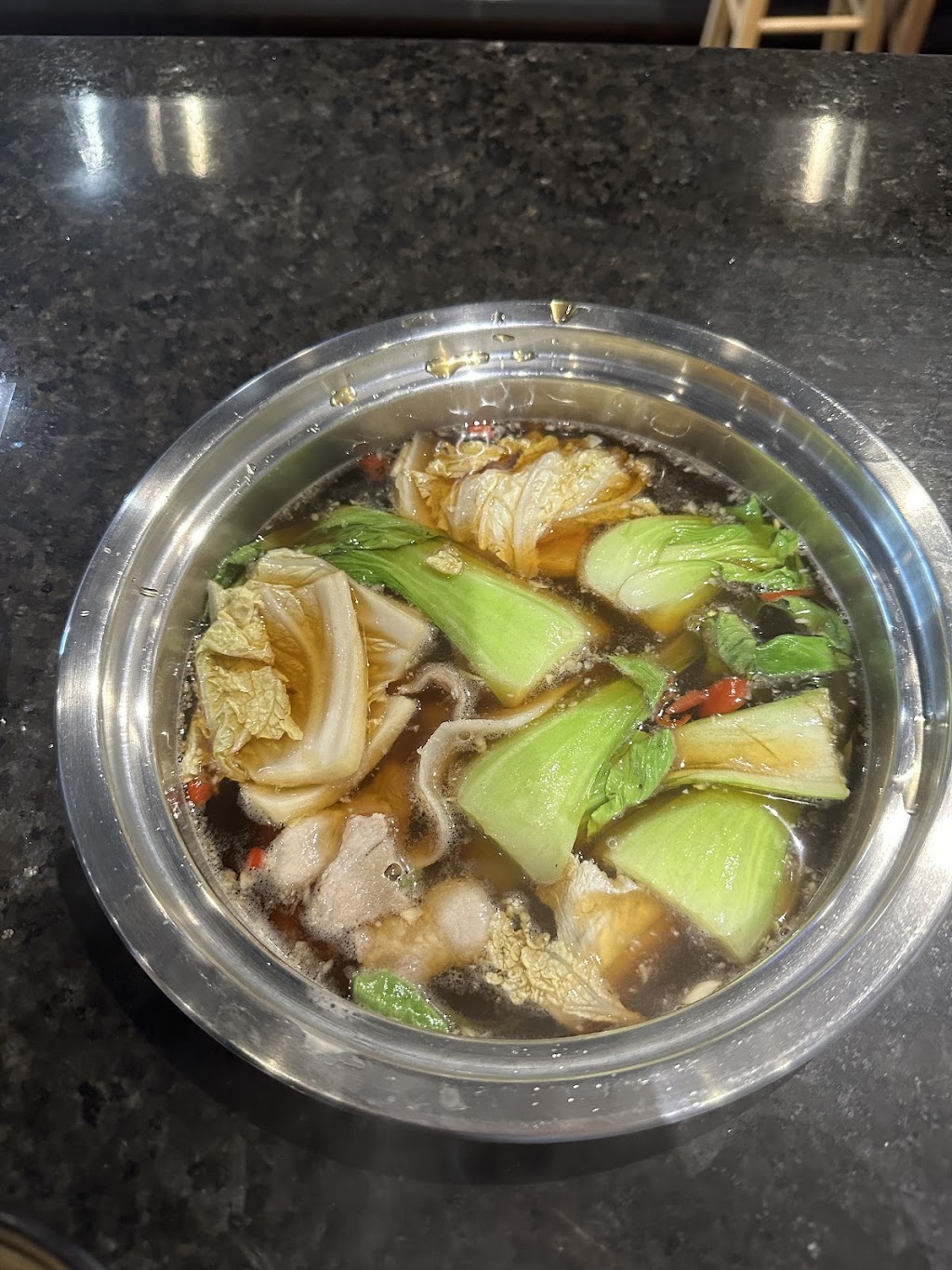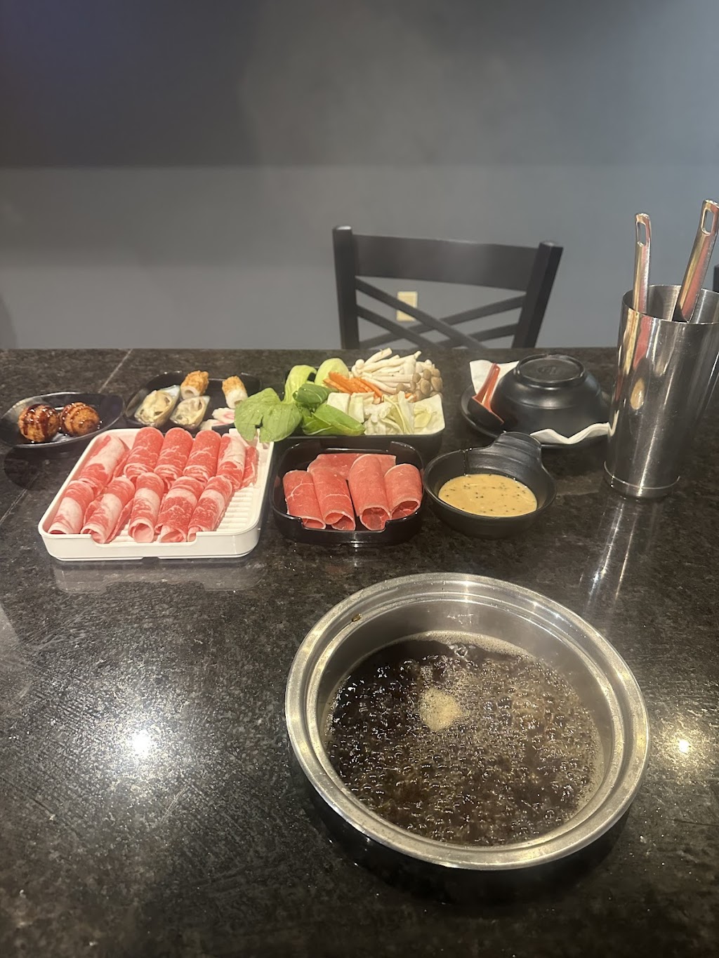 Appetizer for my first round , Takoyaki , shrimp tempura and chicken wing . It's really yummy with Thai ice tea . And for my soup I got the Tonkotsu, it tasted creamy and delicious and was really good my meat. Moreover the seafood and veggies that I got were really fresh and healthy. For the side dishes I got the homemade garlic fired rice which had really good flavor of garlic. Also, I got the dipping sauces such as ponzu and sesame sauce, and you need more spicy they also have some more fresh garlic and chillies, you can ask the server for them. Lastly, for the dessert I got the green tea ice cream, it was very fresh and richy but I forgot to take the picture of it. With the price $34.99, it's a good deal, I'll be back!
