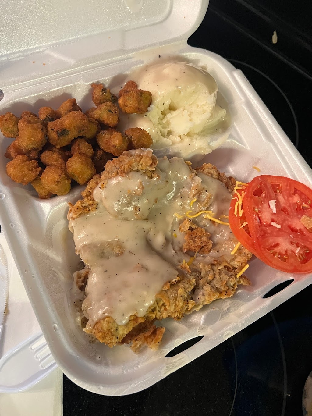 Drive in dinner with a good selection. Tried the chicken fried chicken with green beans and mashed potatoes. Service was good and the place was not crowded. The size of the chicken was huge and was topped with a tasty gravy. The serving also came with a bread toasted. Green beans were good and the mashed potatoes also had gravy. I used the toasted bread to soak up the leftover gravy. This was good southern cooking for sure.