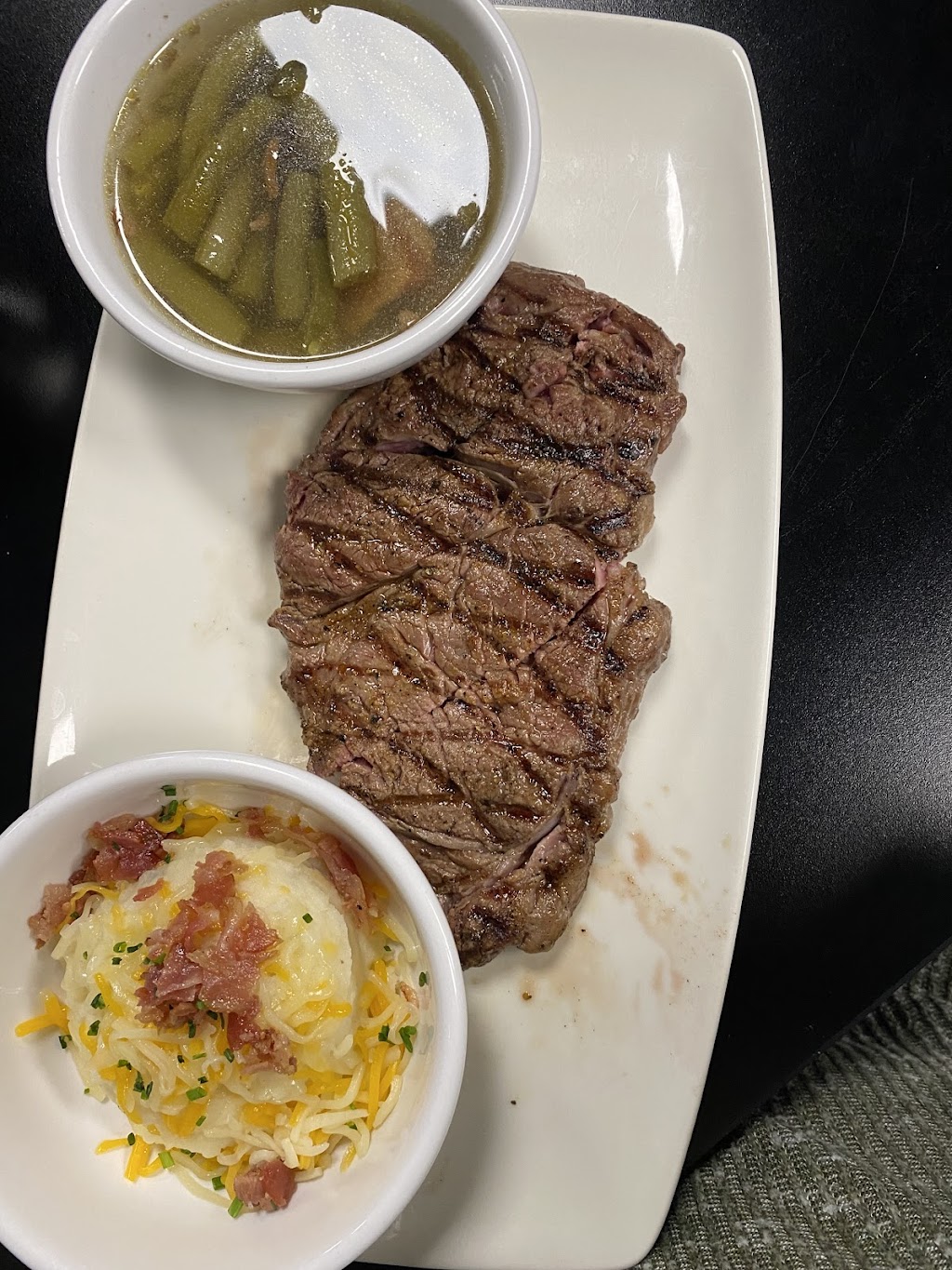 We were the only ones there until the last 10 minutes our server Kelsey was very attentive. I had the 8 oz ribeye, great Smokey grilled taste, did not need any steak sauce, hubby had the New York strip, said it was really good too! We also had the blooming onion, that sauce was really good, spicy but good!! We really liked it!! Most of the reviews are on the Mexican food there so we went traditional American! Lol!!
