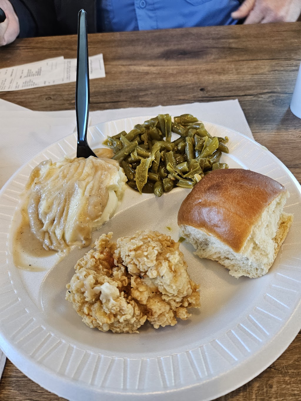 Great customer service at register, but that was the extent of contact. Everyone was sitting and talking right beyond the counter and food prep. I assume waiting for customers. No one checked to see how the meal was. Our coleslaw was good, but the chicken and roll were lukewarm and very dry. The chicken gravy tasted like flour. If people come in to eat, cook it to order. Don't serve us the remnants. OUR FOOD SHOULD HAVE BEEN HOT AND FRESH.